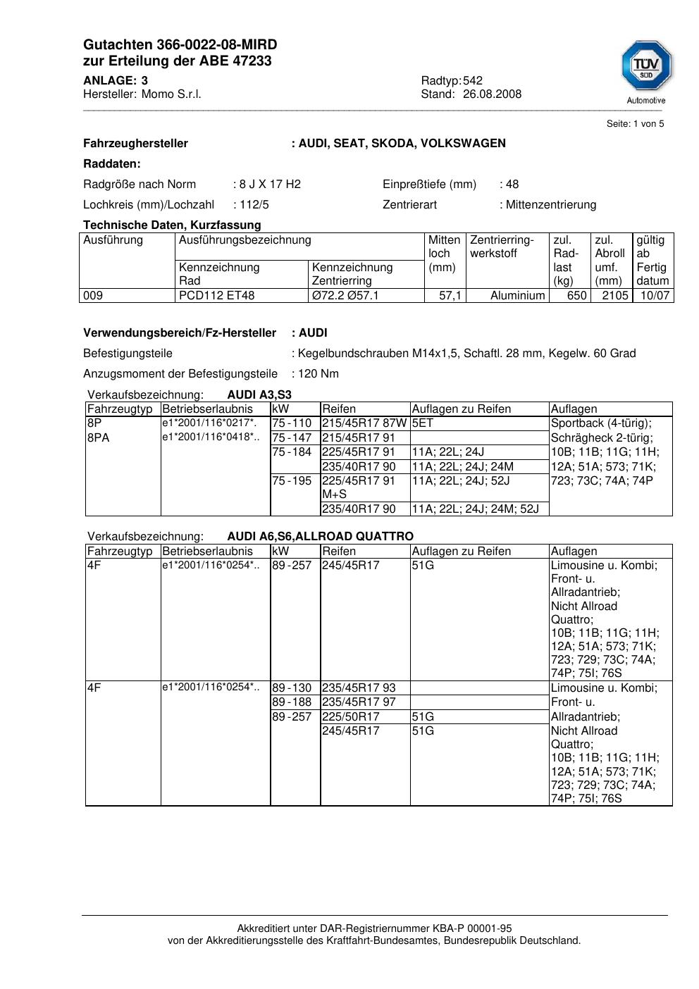 Felgengutachten / abe für Alufelgen brand-momo 542 (8Jx17 ET 0, Mittenloch 0 mm) mit KBA 47233 (Zertifikatsnummer 47233). Hier kostenlos als PDF herunterladen. Der Download-Link ist 24 Stunden gültig und kann bis zu zwei Mal verwendet werden.