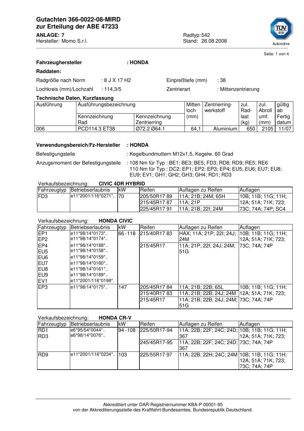 Dieses Gutachten (abe) bezieht sich auf die Alufelge brand-momo 542 in der Ausführung 8Jx17 ET 0, Mittenloch 0 mm (KBA 47233). Im PDF findest du typischerweise zulässige Reifengrößen, Auflagen/Anbauhinweise und – je nach Dokument – Hinweise zur Eintragung.