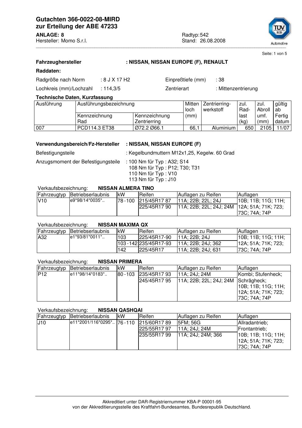 Dieses Gutachten (abe) bezieht sich auf die Alufelge brand-momo 542 in der Ausführung 8Jx17 ET 0, Mittenloch 0 mm (KBA 47233). Im PDF findest du typischerweise zulässige Reifengrößen, Auflagen/Anbauhinweise und – je nach Dokument – Hinweise zur Eintragung.