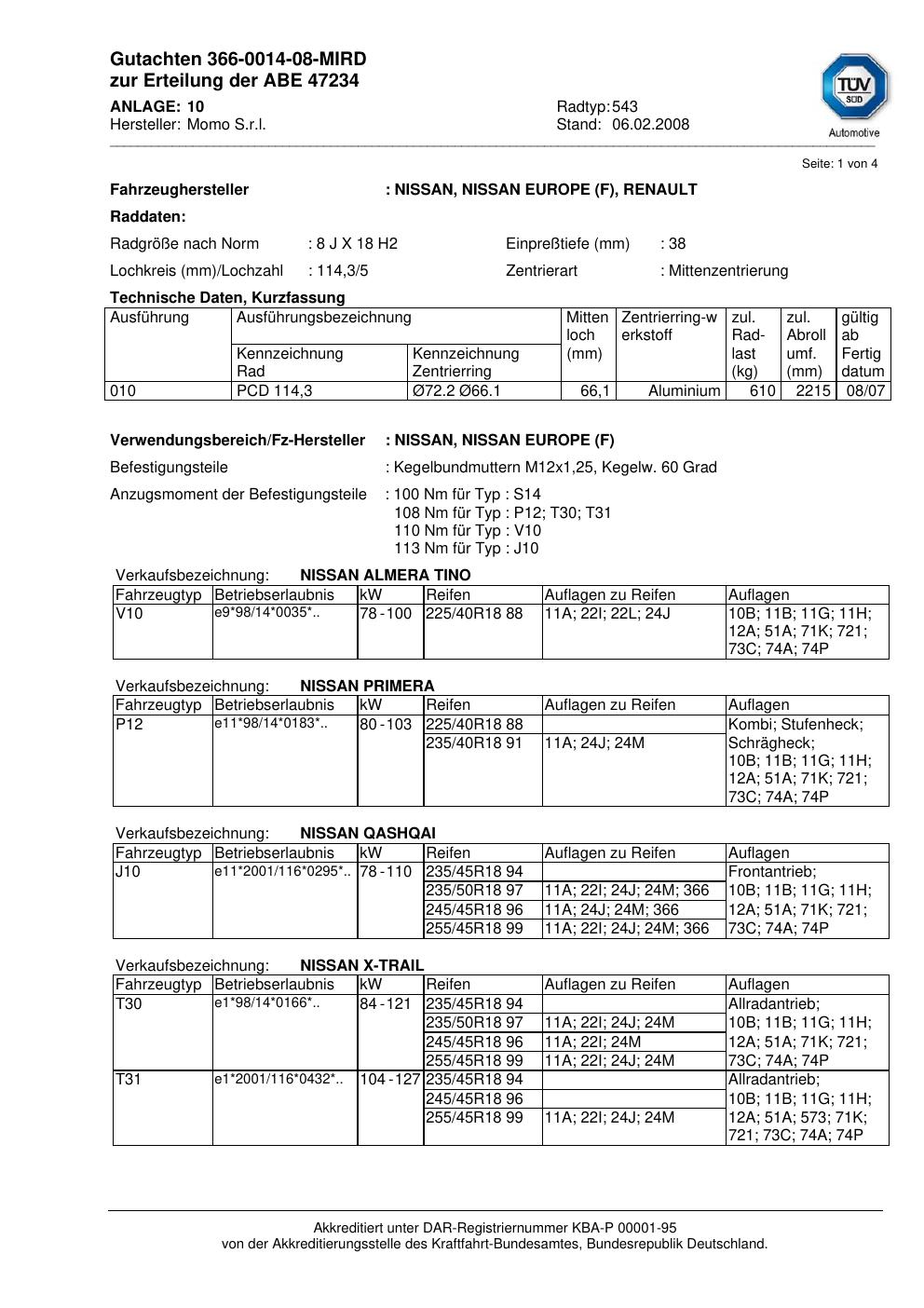Dieses Gutachten (abe) bezieht sich auf die Alufelge brand-momo 543 in der Ausführung 8Jx18 ET 0, Mittenloch 0 mm (KBA 47234). Im PDF findest du typischerweise zulässige Reifengrößen, Auflagen/Anbauhinweise und – je nach Dokument – Hinweise zur Eintragung.