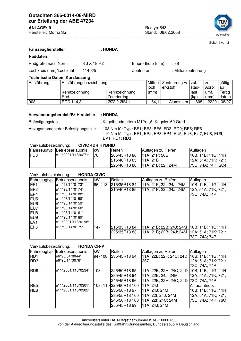 Dieses Gutachten (abe) bezieht sich auf die Alufelge brand-momo 543 in der Ausführung 8Jx18 ET 0, Mittenloch 0 mm (KBA 47234). Im PDF findest du typischerweise zulässige Reifengrößen, Auflagen/Anbauhinweise und – je nach Dokument – Hinweise zur Eintragung.