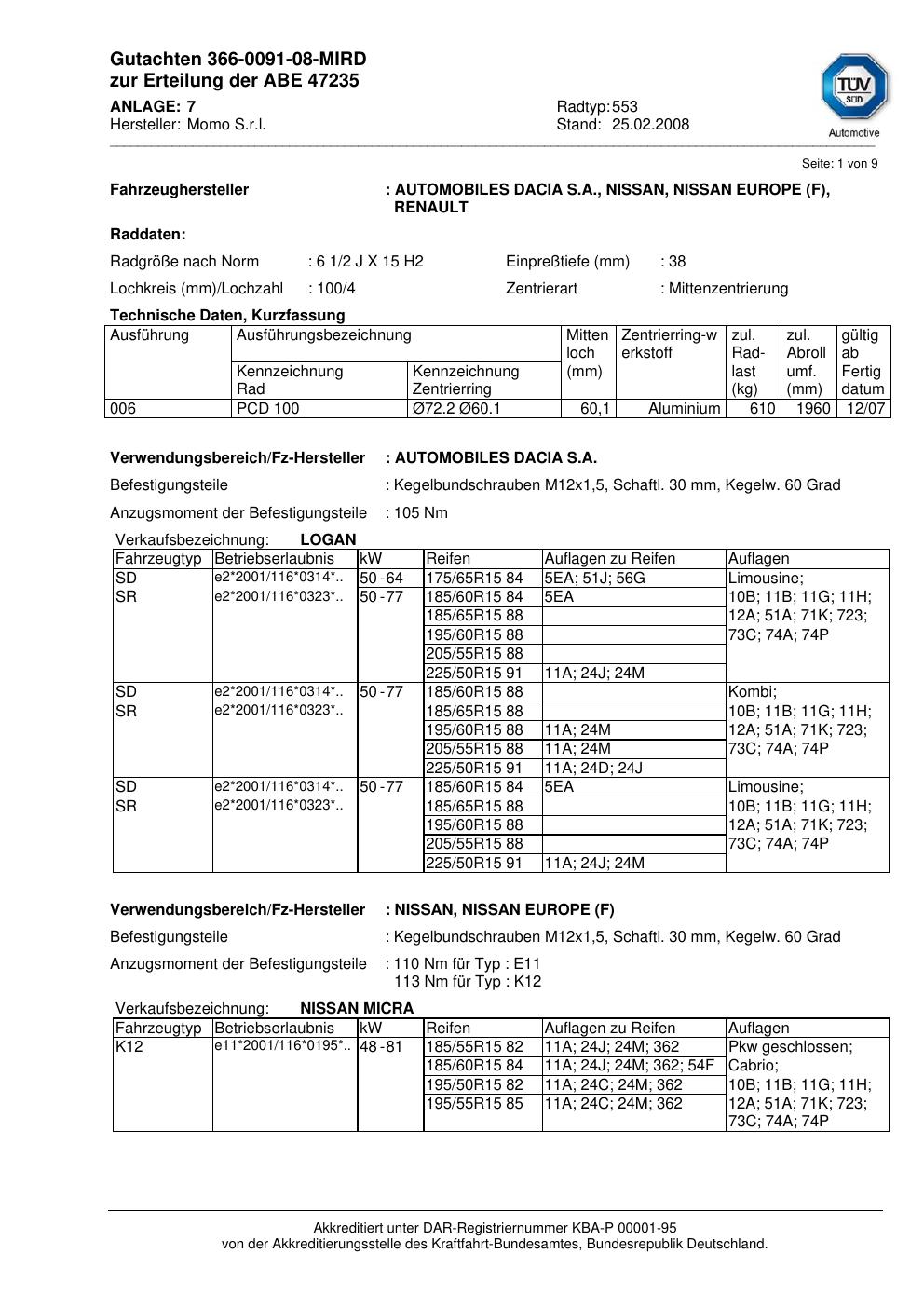 Dieses Gutachten (abe) bezieht sich auf die Alufelge brand-momo 553 in der Ausführung 2Jx15 ET 0, Mittenloch 0 mm (KBA 47235). Im PDF findest du typischerweise zulässige Reifengrößen, Auflagen/Anbauhinweise und – je nach Dokument – Hinweise zur Eintragung.