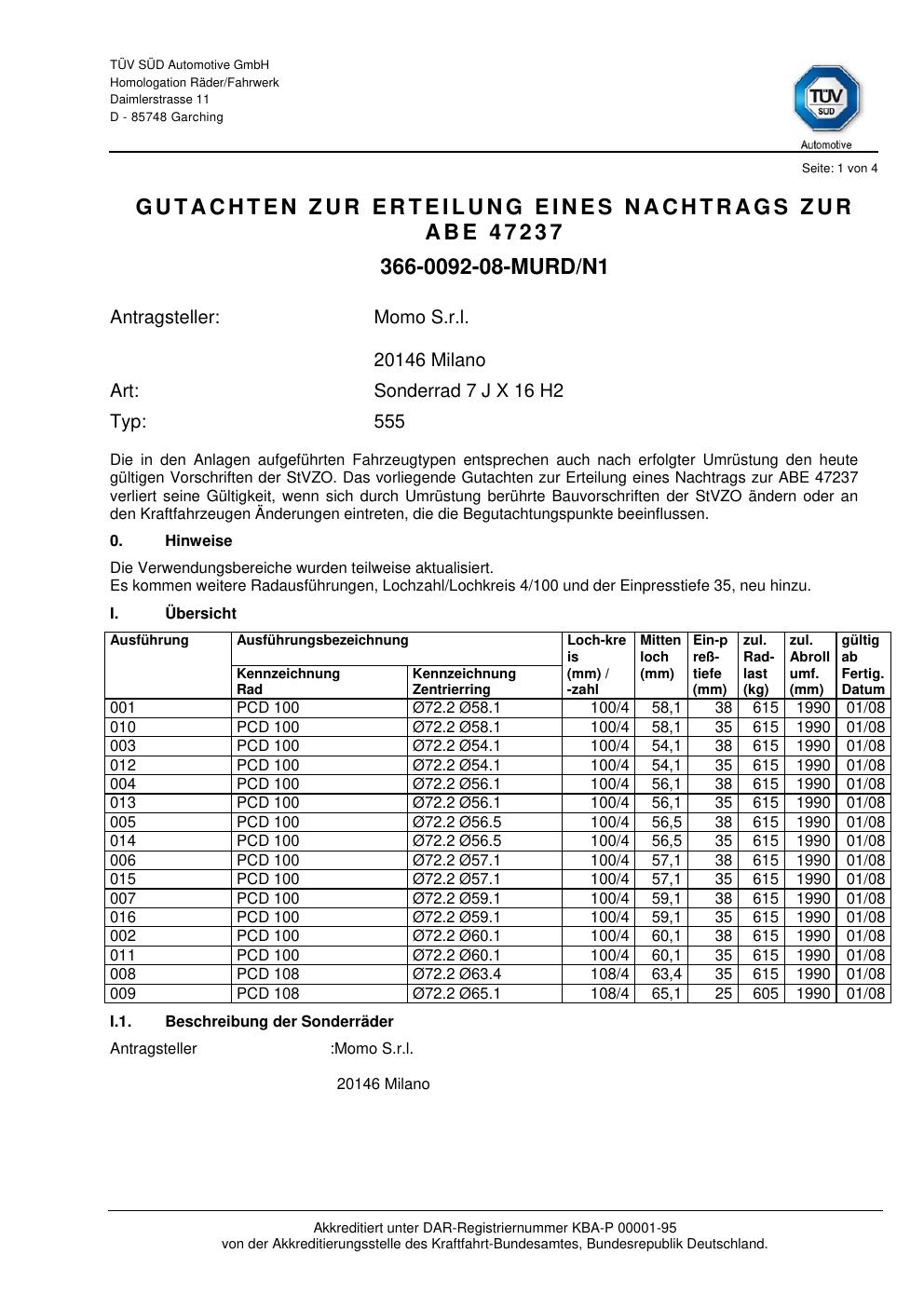 Felgengutachten / abe für Alufelgen ATS 555 (7Jx16 ET 0, Mittenloch 0 mm) mit KBA 47237 (Zertifikatsnummer 47237). Hier kostenlos als PDF herunterladen. Der Download-Link ist 24 Stunden gültig und kann bis zu zwei Mal verwendet werden.