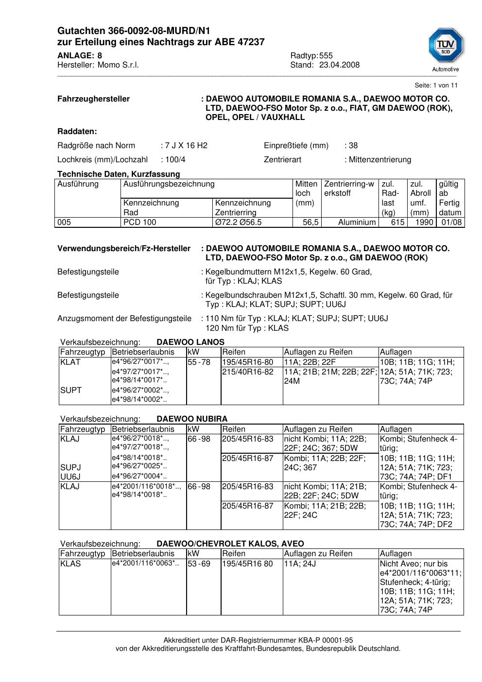 Dieses Gutachten (abe) bezieht sich auf die Alufelge brand-momo 555 in der Ausführung 7Jx16 ET 0, Mittenloch 0 mm (KBA 47237). Im PDF findest du typischerweise zulässige Reifengrößen, Auflagen/Anbauhinweise und – je nach Dokument – Hinweise zur Eintragung.