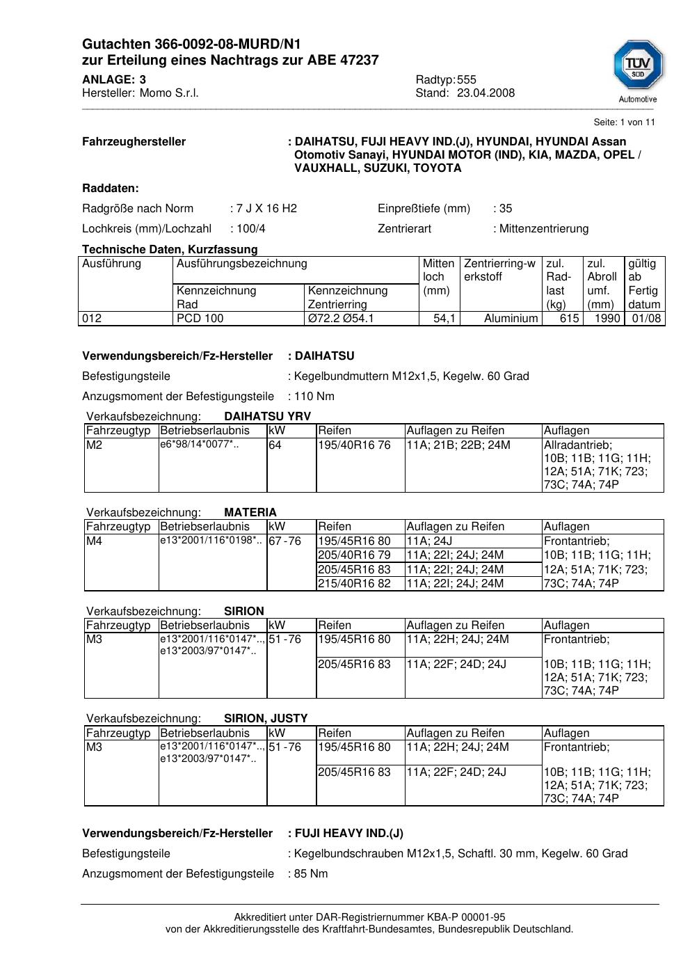 Dieses Gutachten (abe) bezieht sich auf die Alufelge brand-momo 555 in der Ausführung 7Jx16 ET 0, Mittenloch 0 mm (KBA 47237). Im PDF findest du typischerweise zulässige Reifengrößen, Auflagen/Anbauhinweise und – je nach Dokument – Hinweise zur Eintragung.