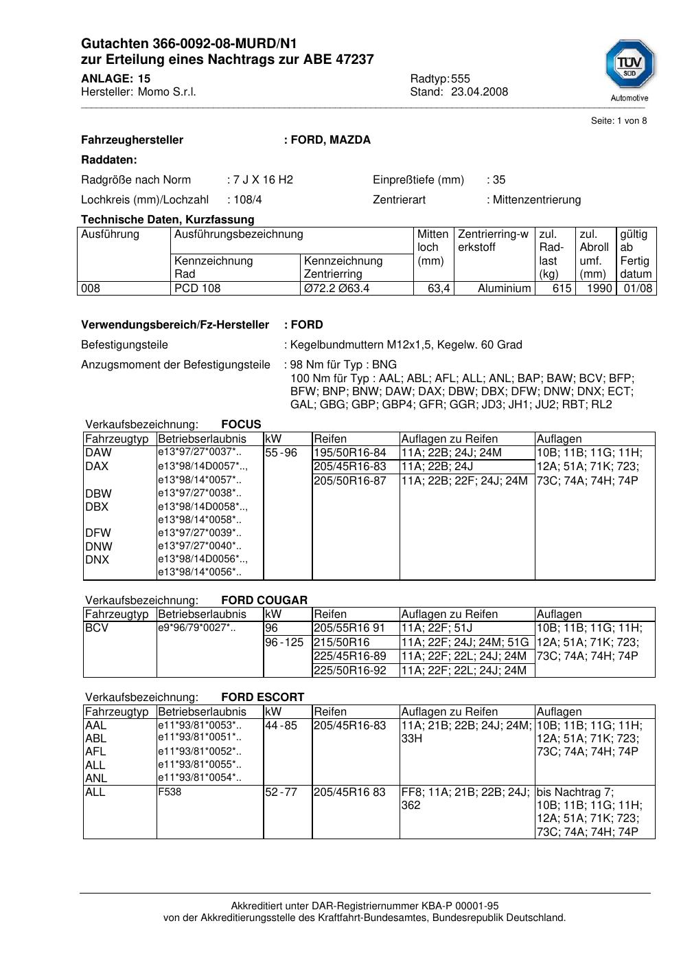 Dieses Gutachten (abe) bezieht sich auf die Alufelge brand-momo 555 in der Ausführung 7Jx16 ET 0, Mittenloch 0 mm (KBA 47237). Im PDF findest du typischerweise zulässige Reifengrößen, Auflagen/Anbauhinweise und – je nach Dokument – Hinweise zur Eintragung.