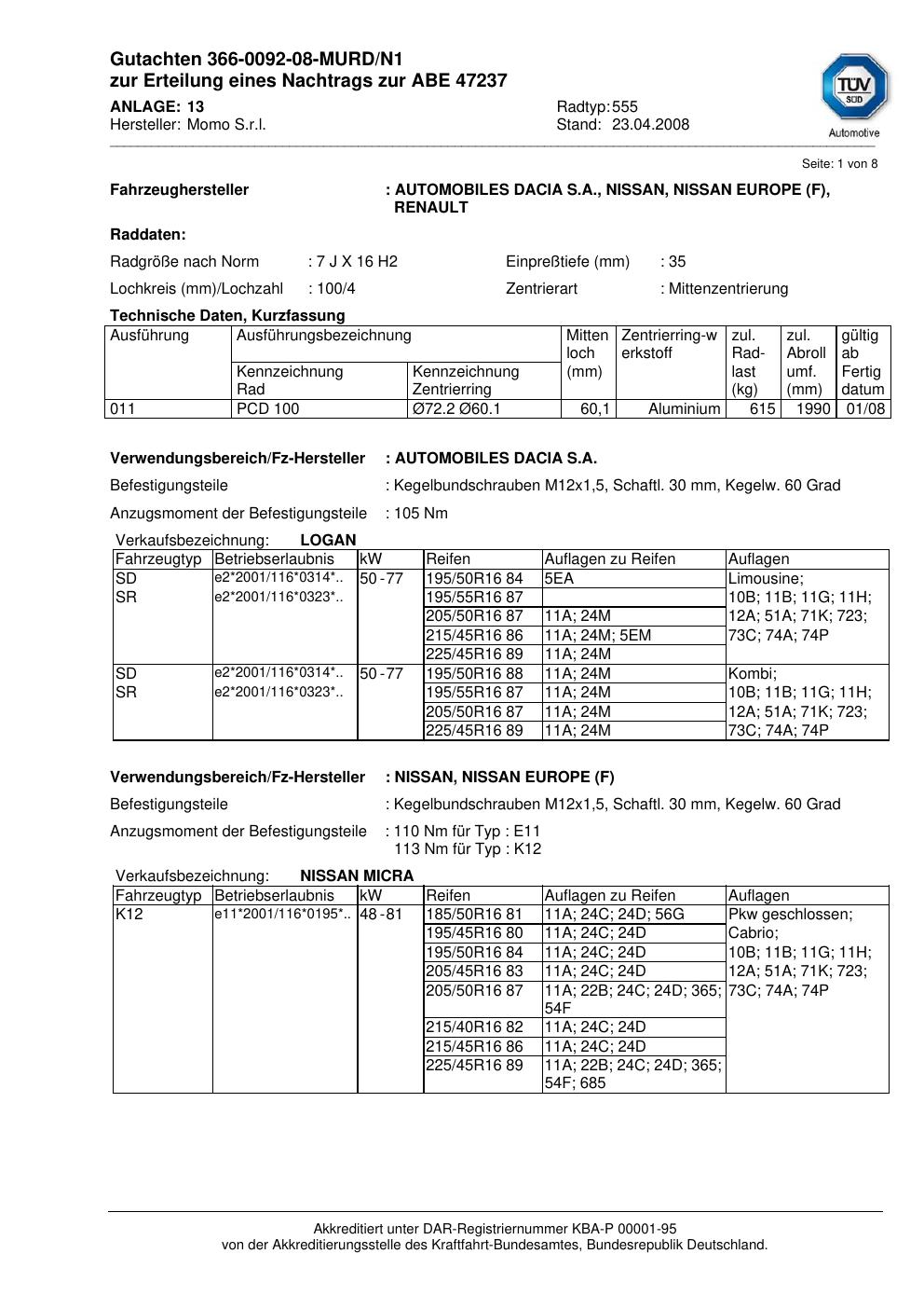 Dieses Gutachten (abe) bezieht sich auf die Alufelge brand-momo 555 in der Ausführung 7Jx16 ET 0, Mittenloch 0 mm (KBA 47237). Im PDF findest du typischerweise zulässige Reifengrößen, Auflagen/Anbauhinweise und – je nach Dokument – Hinweise zur Eintragung.