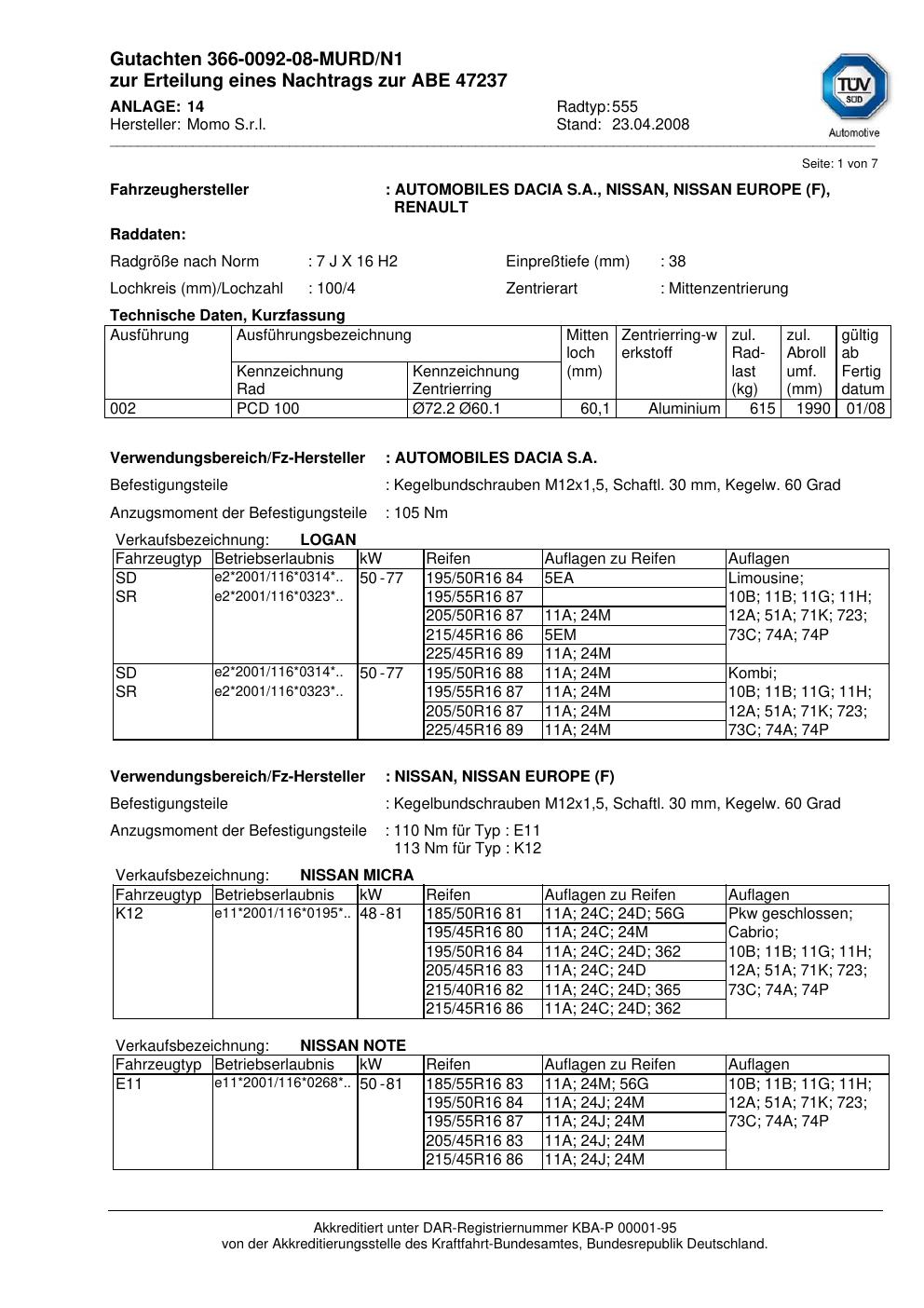 Dieses Gutachten (abe) bezieht sich auf die Alufelge brand-momo 555 in der Ausführung 7Jx16 ET 0, Mittenloch 0 mm (KBA 47237). Im PDF findest du typischerweise zulässige Reifengrößen, Auflagen/Anbauhinweise und – je nach Dokument – Hinweise zur Eintragung.