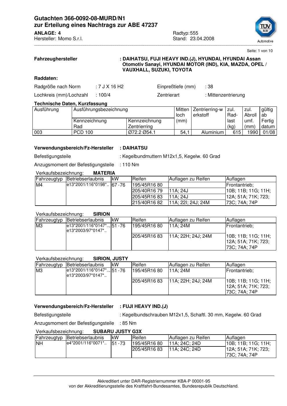 Dieses Gutachten (abe) bezieht sich auf die Alufelge brand-momo 555 in der Ausführung 7Jx16 ET 0, Mittenloch 0 mm (KBA 47237). Im PDF findest du typischerweise zulässige Reifengrößen, Auflagen/Anbauhinweise und – je nach Dokument – Hinweise zur Eintragung.