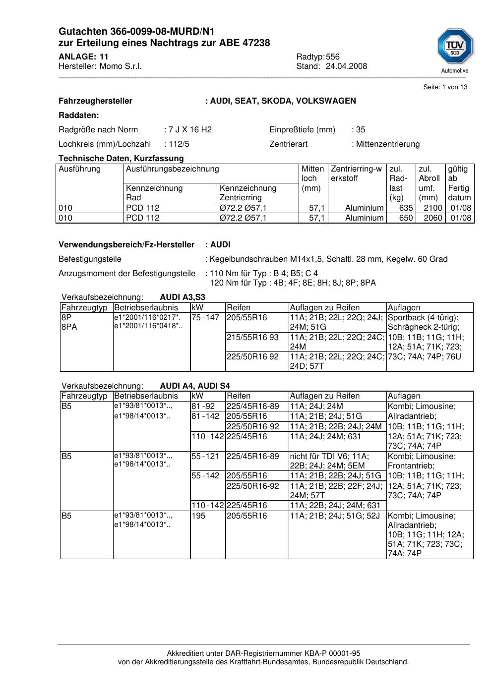 Dieses Gutachten (abe) bezieht sich auf die Alufelge brand-momo 556 in der Ausführung 7Jx16 ET 0, Mittenloch 0 mm (KBA 47238). Im PDF findest du typischerweise zulässige Reifengrößen, Auflagen/Anbauhinweise und – je nach Dokument – Hinweise zur Eintragung.