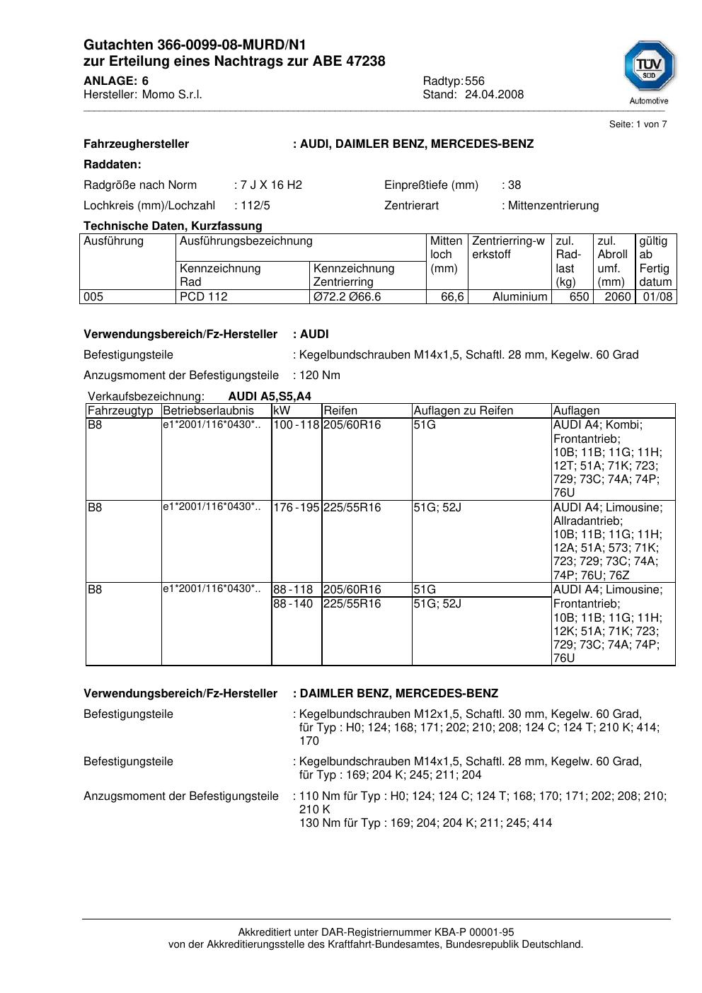 Dieses Gutachten (abe) bezieht sich auf die Alufelge brand-momo 556 in der Ausführung 7Jx16 ET 0, Mittenloch 0 mm (KBA 47238). Im PDF findest du typischerweise zulässige Reifengrößen, Auflagen/Anbauhinweise und – je nach Dokument – Hinweise zur Eintragung.