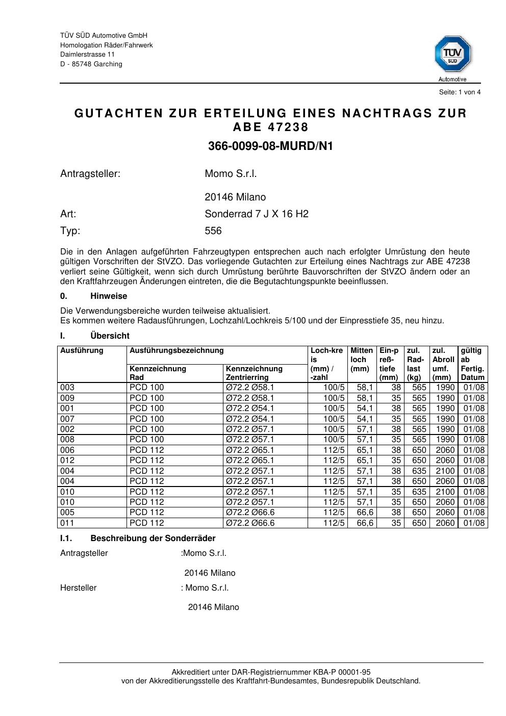 Felgengutachten / abe für Alufelgen Momo 556 (7Jx16 ET 0, Mittenloch 0 mm) mit KBA 47238 (Zertifikatsnummer 47238). Hier kostenlos als PDF herunterladen. Der Download-Link ist 24 Stunden gültig und kann bis zu zwei Mal verwendet werden.