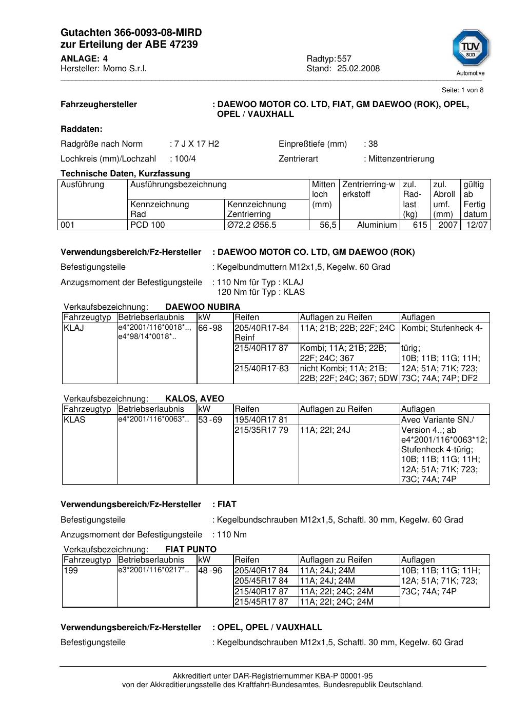 Dieses Gutachten (abe) bezieht sich auf die Alufelge brand-momo 557 in der Ausführung 7Jx17 ET 0, Mittenloch 0 mm (KBA 47239). Im PDF findest du typischerweise zulässige Reifengrößen, Auflagen/Anbauhinweise und – je nach Dokument – Hinweise zur Eintragung.