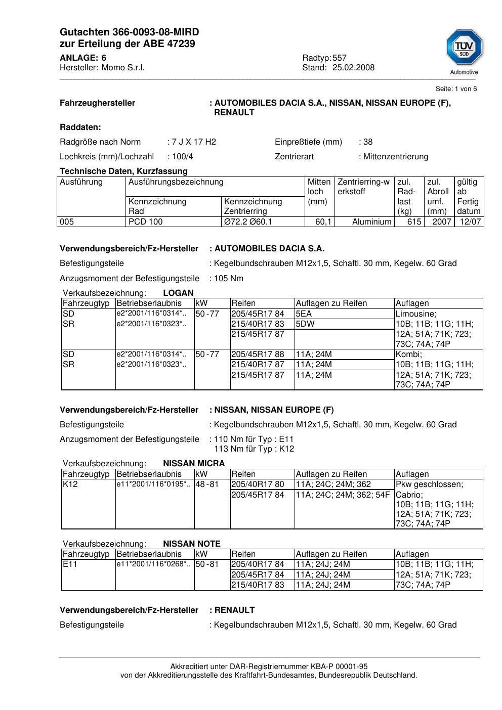 Dieses Gutachten (abe) bezieht sich auf die Alufelge brand-momo 557 in der Ausführung 7Jx17 ET 0, Mittenloch 0 mm (KBA 47239). Im PDF findest du typischerweise zulässige Reifengrößen, Auflagen/Anbauhinweise und – je nach Dokument – Hinweise zur Eintragung.