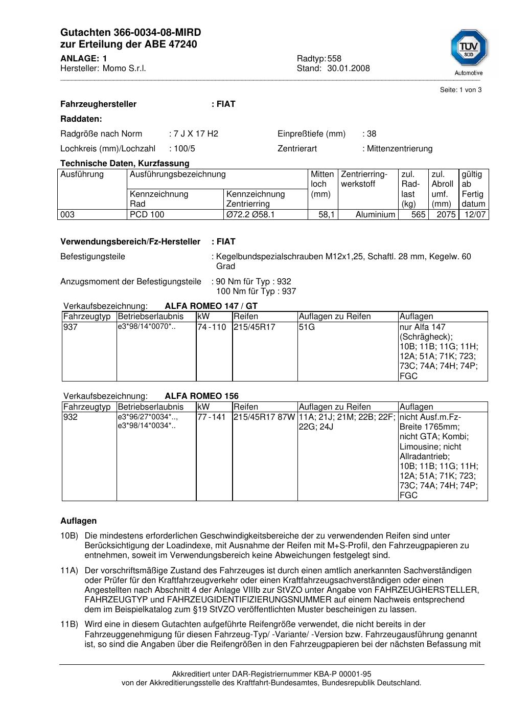 Dieses Gutachten (abe) bezieht sich auf die Alufelge brand-momo 558 in der Ausführung 7Jx17 ET 0, Mittenloch 0 mm (KBA 47240). Im PDF findest du typischerweise zulässige Reifengrößen, Auflagen/Anbauhinweise und – je nach Dokument – Hinweise zur Eintragung.