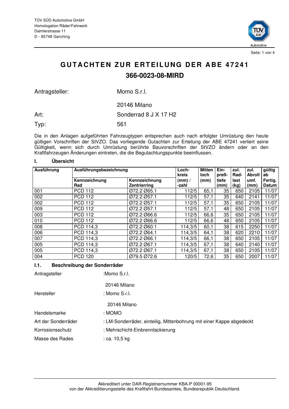 Dieses Gutachten (abe) bezieht sich auf die Alufelge Momo 561 in der Ausführung 8Jx17 ET 0, Mittenloch 0 mm (KBA 47241). Im PDF findest du typischerweise zulässige Reifengrößen, Auflagen/Anbauhinweise und – je nach Dokument – Hinweise zur Eintragung.