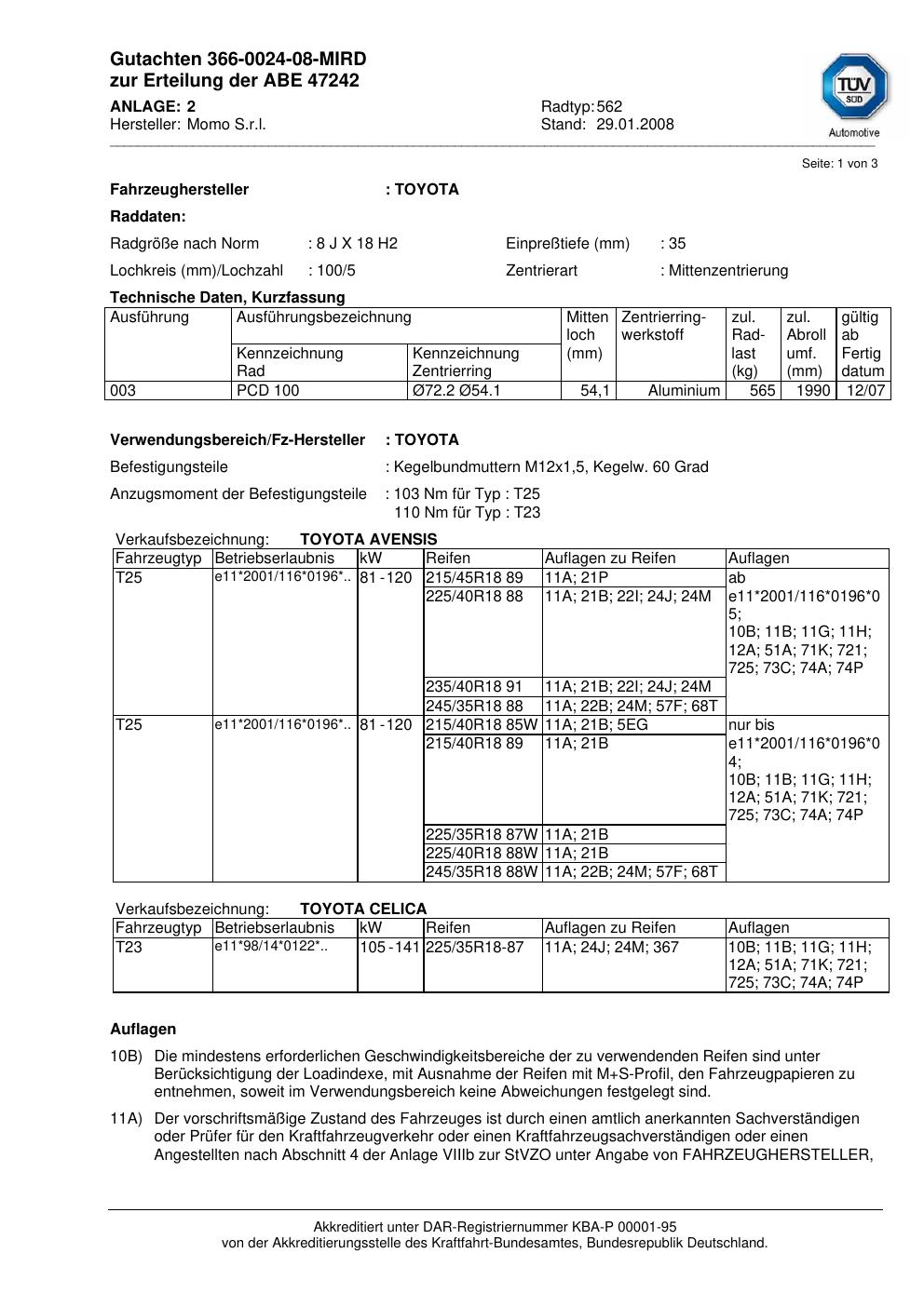 Dieses Gutachten (abe) bezieht sich auf die Alufelge brand-momo 562 in der Ausführung 8Jx18 ET 0, Mittenloch 0 mm (KBA 47242). Im PDF findest du typischerweise zulässige Reifengrößen, Auflagen/Anbauhinweise und – je nach Dokument – Hinweise zur Eintragung.