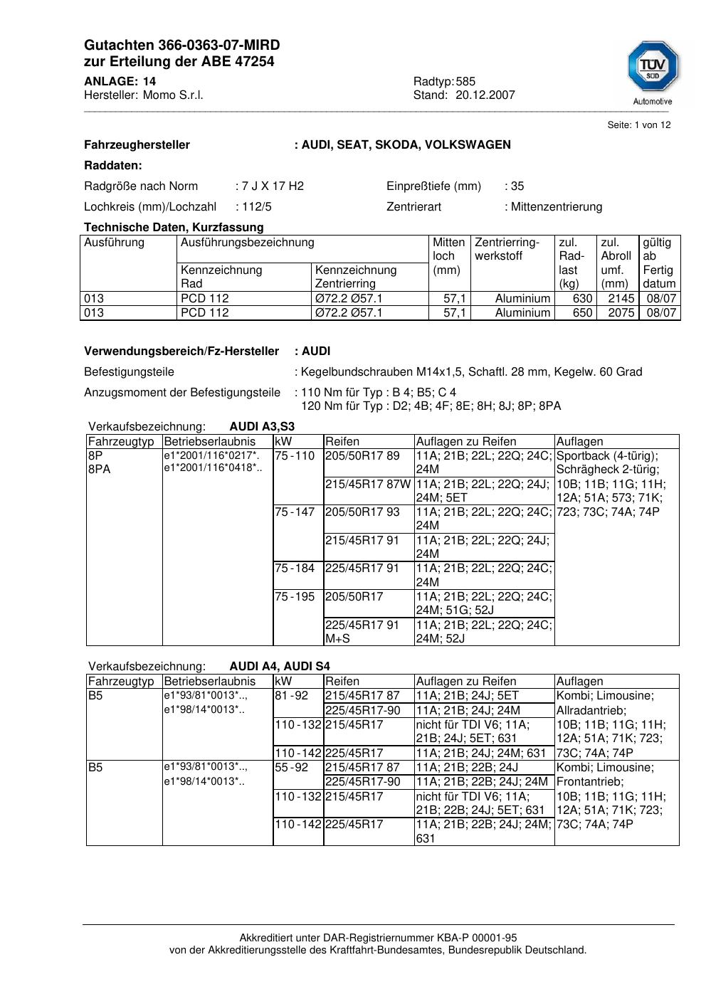 Dieses Gutachten (abe) bezieht sich auf die Alufelge brand-momo 585 in der Ausführung 7Jx17 ET 0, Mittenloch 0 mm (KBA 47254). Im PDF findest du typischerweise zulässige Reifengrößen, Auflagen/Anbauhinweise und – je nach Dokument – Hinweise zur Eintragung.