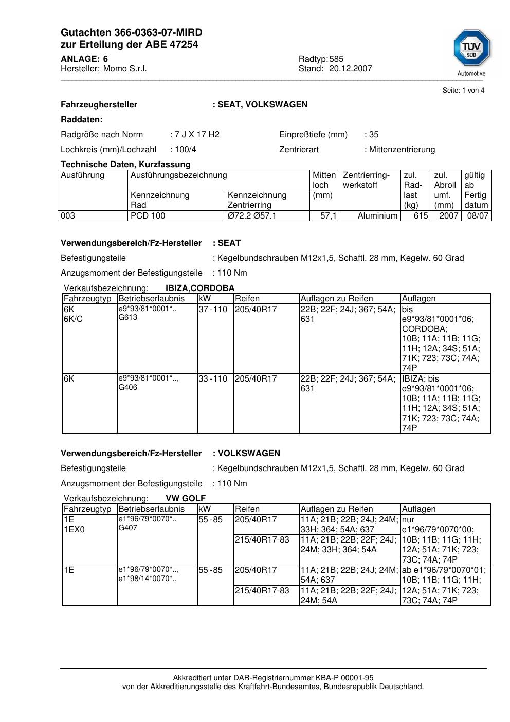 Dieses Gutachten (abe) bezieht sich auf die Alufelge brand-momo 585 in der Ausführung 7Jx17 ET 0, Mittenloch 0 mm (KBA 47254). Im PDF findest du typischerweise zulässige Reifengrößen, Auflagen/Anbauhinweise und – je nach Dokument – Hinweise zur Eintragung.