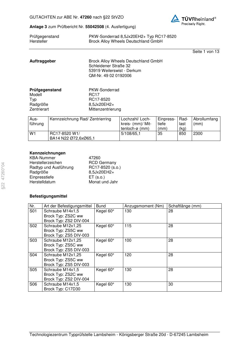 Dieses Gutachten (abe) bezieht sich auf die Alufelge Brock RC17-8 520 in der Ausführung ET 0, Mittenloch 0 mm (KBA 47260). Im PDF findest du typischerweise zulässige Reifengrößen, Auflagen/Anbauhinweise und – je nach Dokument – Hinweise zur Eintragung.