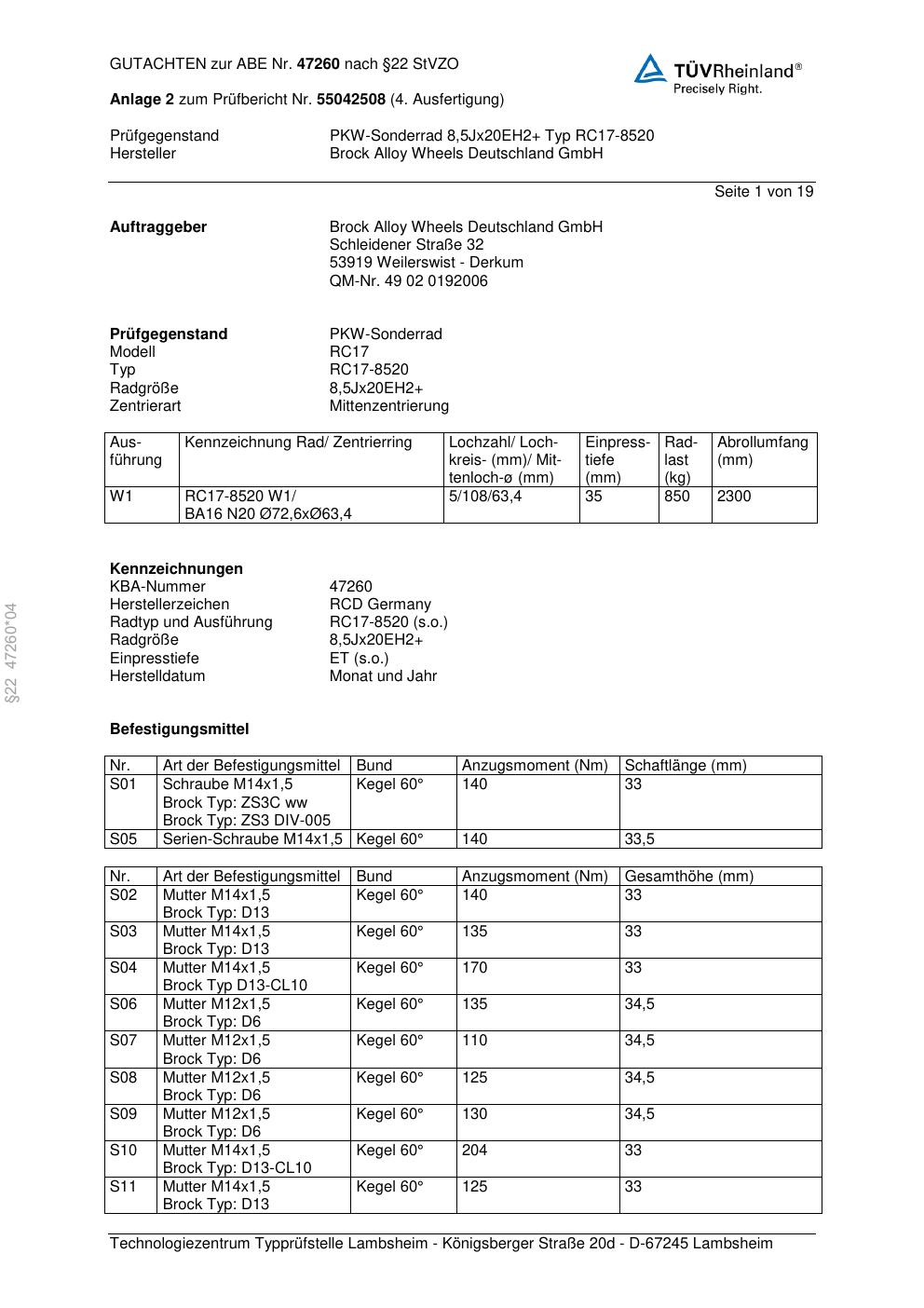 Dieses Gutachten (abe) bezieht sich auf die Alufelge Brock RC17-8 520 in der Ausführung 8.5Jx21 ET 0, Mittenloch 0 mm (KBA 47260). Im PDF findest du typischerweise zulässige Reifengrößen, Auflagen/Anbauhinweise und – je nach Dokument – Hinweise zur Eintragung.
