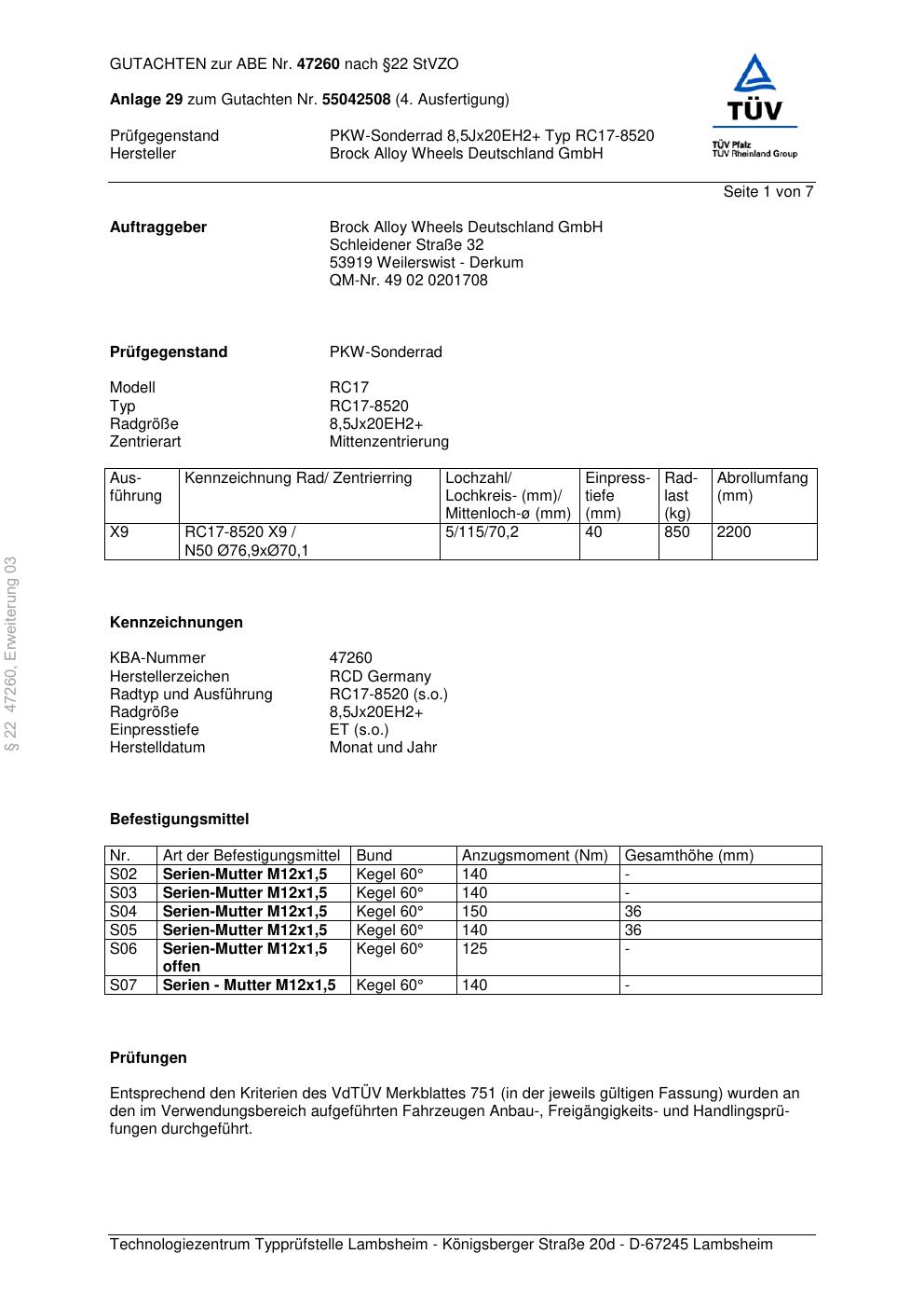 Dieses Gutachten (abe) bezieht sich auf die Alufelge Brock RC17-8 520 in der Ausführung ET 0, Mittenloch 0 mm (KBA 47260). Im PDF findest du typischerweise zulässige Reifengrößen, Auflagen/Anbauhinweise und – je nach Dokument – Hinweise zur Eintragung.