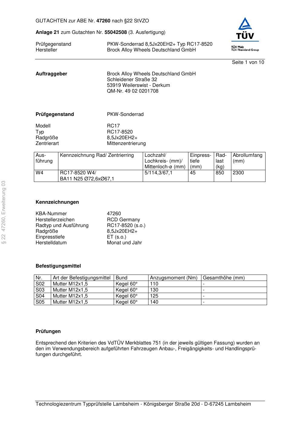 Dieses Gutachten (abe) bezieht sich auf die Alufelge Brock RC17-8 520 in der Ausführung ET 0, Mittenloch 0 mm (KBA 47260). Im PDF findest du typischerweise zulässige Reifengrößen, Auflagen/Anbauhinweise und – je nach Dokument – Hinweise zur Eintragung.