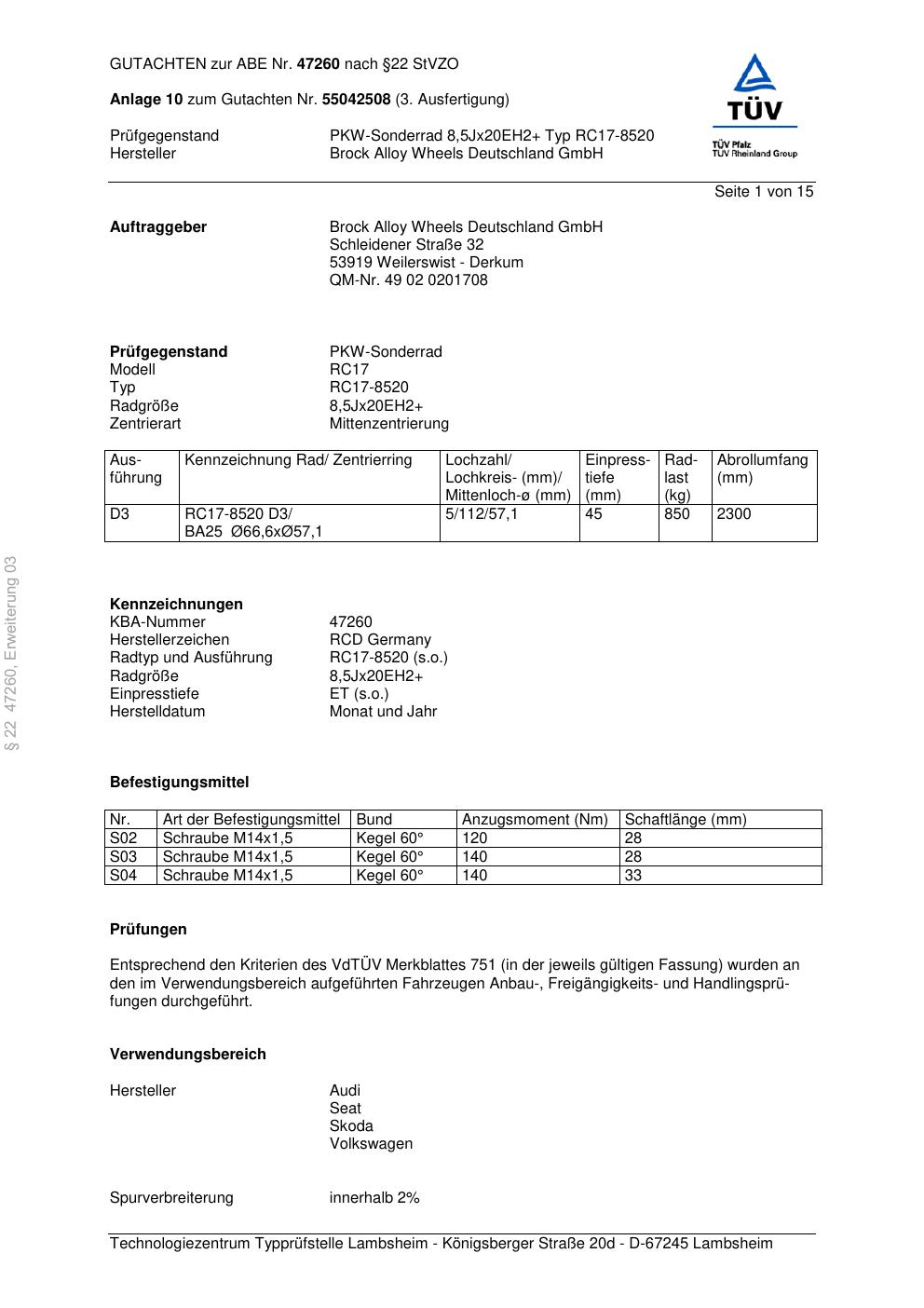 Dieses Gutachten (abe) bezieht sich auf die Alufelge Brock RC17-8 520 in der Ausführung ET 0, Mittenloch 0 mm (KBA 47260). Im PDF findest du typischerweise zulässige Reifengrößen, Auflagen/Anbauhinweise und – je nach Dokument – Hinweise zur Eintragung.