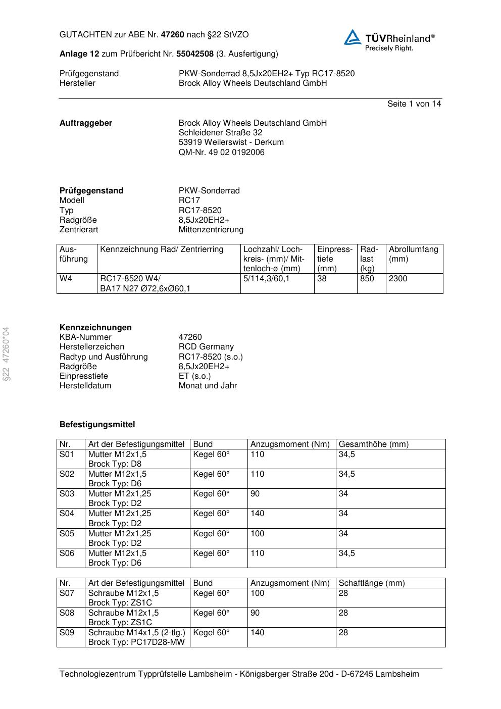 Dieses Gutachten (abe) bezieht sich auf die Alufelge Brock RC17-8 520 in der Ausführung ET 0, Mittenloch 0 mm (KBA 47260). Im PDF findest du typischerweise zulässige Reifengrößen, Auflagen/Anbauhinweise und – je nach Dokument – Hinweise zur Eintragung.