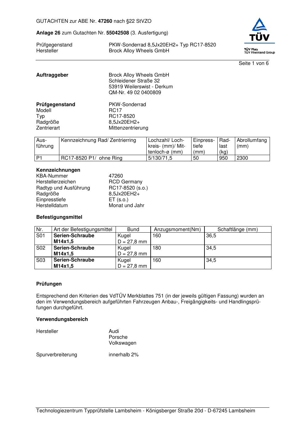 Dieses Gutachten (abe) bezieht sich auf die Alufelge Brock RC17-8 520 in der Ausführung ET 0, Mittenloch 0 mm (KBA 47260). Im PDF findest du typischerweise zulässige Reifengrößen, Auflagen/Anbauhinweise und – je nach Dokument – Hinweise zur Eintragung.