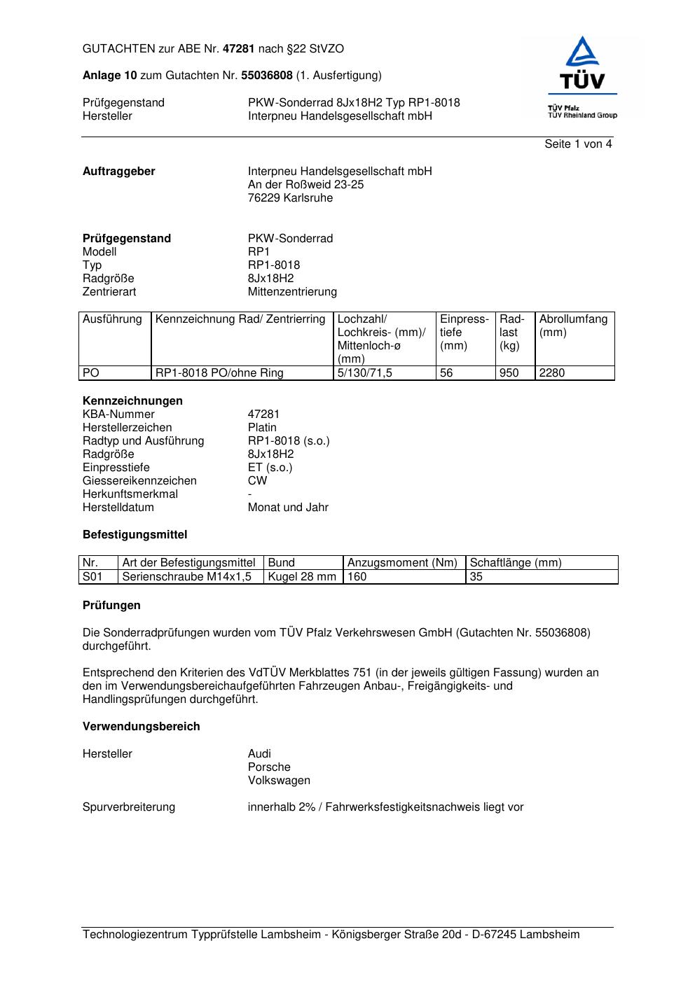 Dieses Gutachten (abe) bezieht sich auf die Alufelge Platin RP1-8018 in der Ausführung 8Jx18 ET 0, Mittenloch 0 mm (KBA 47281). Im PDF findest du typischerweise zulässige Reifengrößen, Auflagen/Anbauhinweise und – je nach Dokument – Hinweise zur Eintragung.