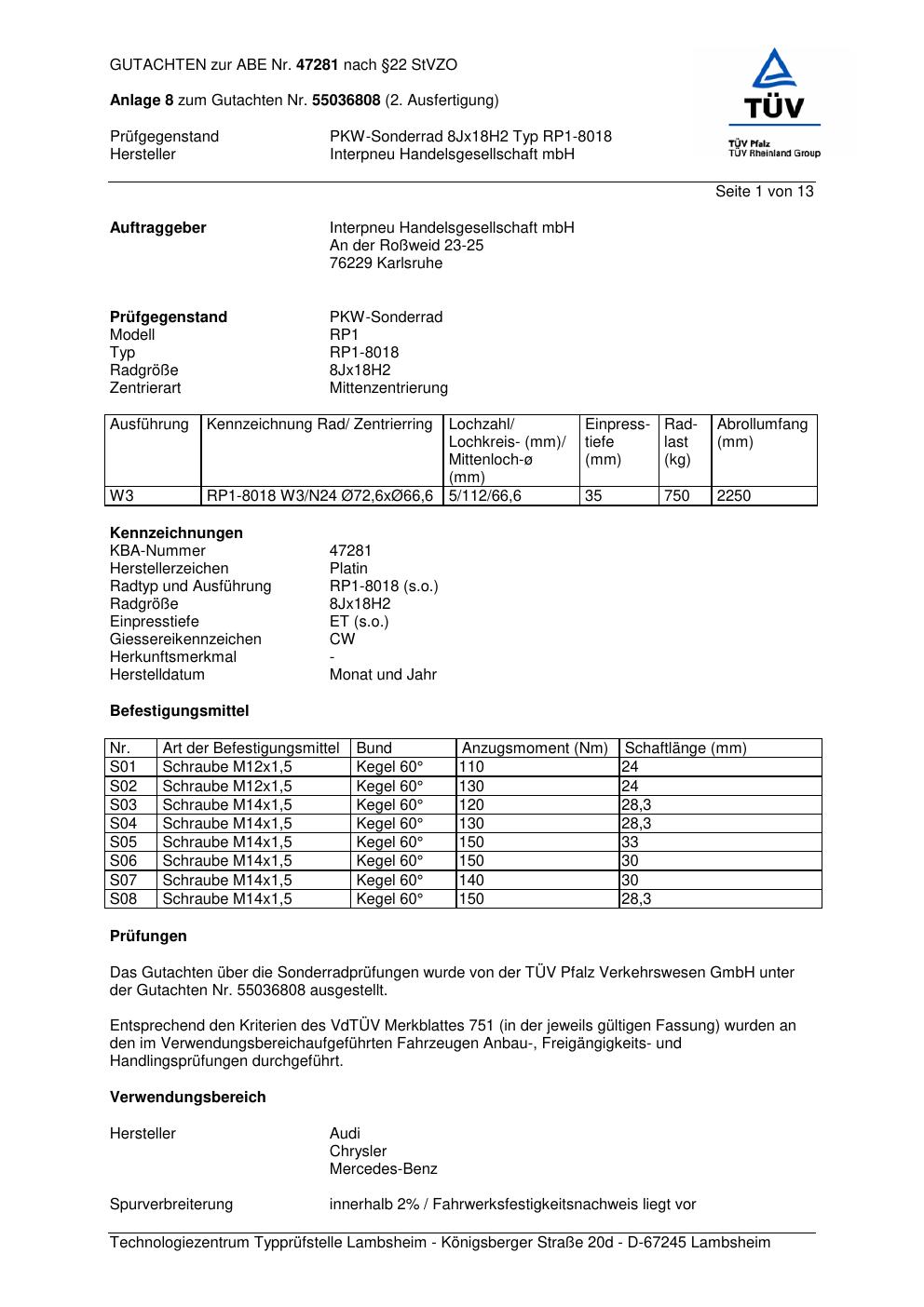 Dieses Gutachten (abe) bezieht sich auf die Alufelge Platin RP1-8018 in der Ausführung 8Jx18 ET 0, Mittenloch 0 mm (KBA 47281). Im PDF findest du typischerweise zulässige Reifengrößen, Auflagen/Anbauhinweise und – je nach Dokument – Hinweise zur Eintragung.