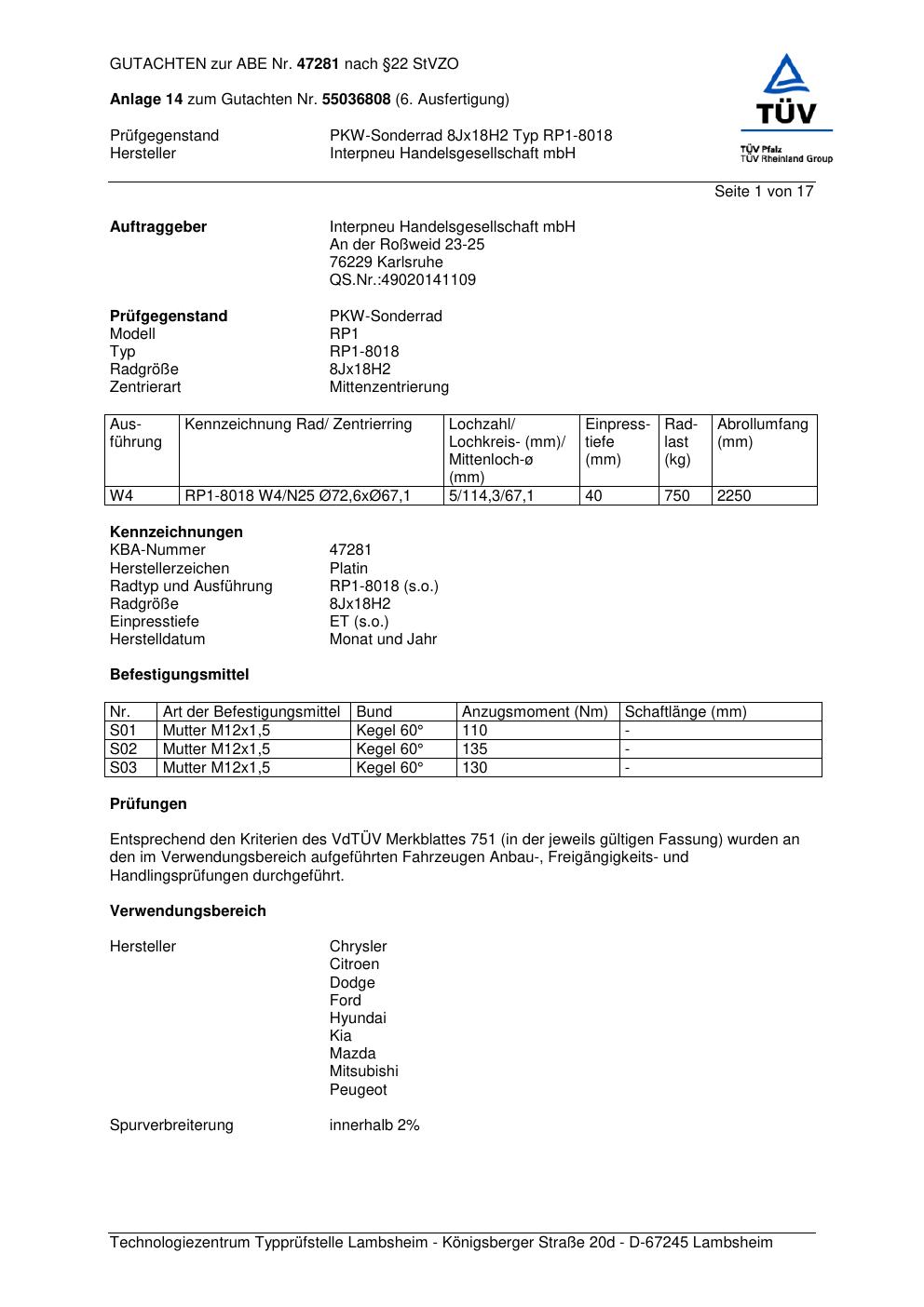 Dieses Gutachten (abe) bezieht sich auf die Alufelge Platin RP1-8018 in der Ausführung 8Jx18 ET 0, Mittenloch 0 mm (KBA 47281). Im PDF findest du typischerweise zulässige Reifengrößen, Auflagen/Anbauhinweise und – je nach Dokument – Hinweise zur Eintragung.