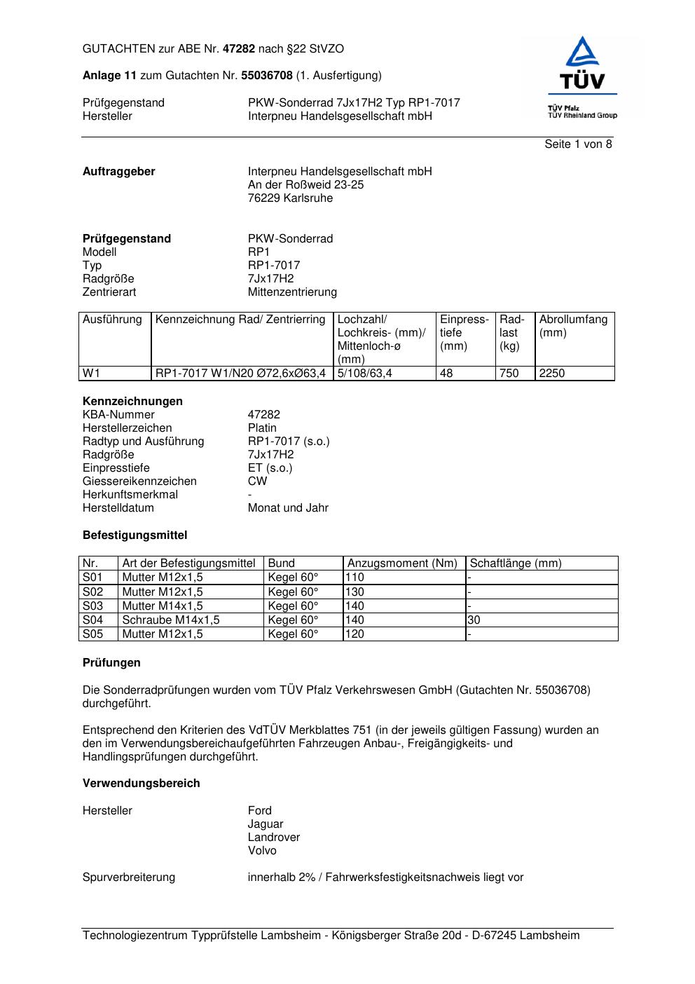 Dieses Gutachten (abe) bezieht sich auf die Alufelge Platin RP1-7017 in der Ausführung 7Jx17 ET 0, Mittenloch 0 mm (KBA 47282). Im PDF findest du typischerweise zulässige Reifengrößen, Auflagen/Anbauhinweise und – je nach Dokument – Hinweise zur Eintragung.