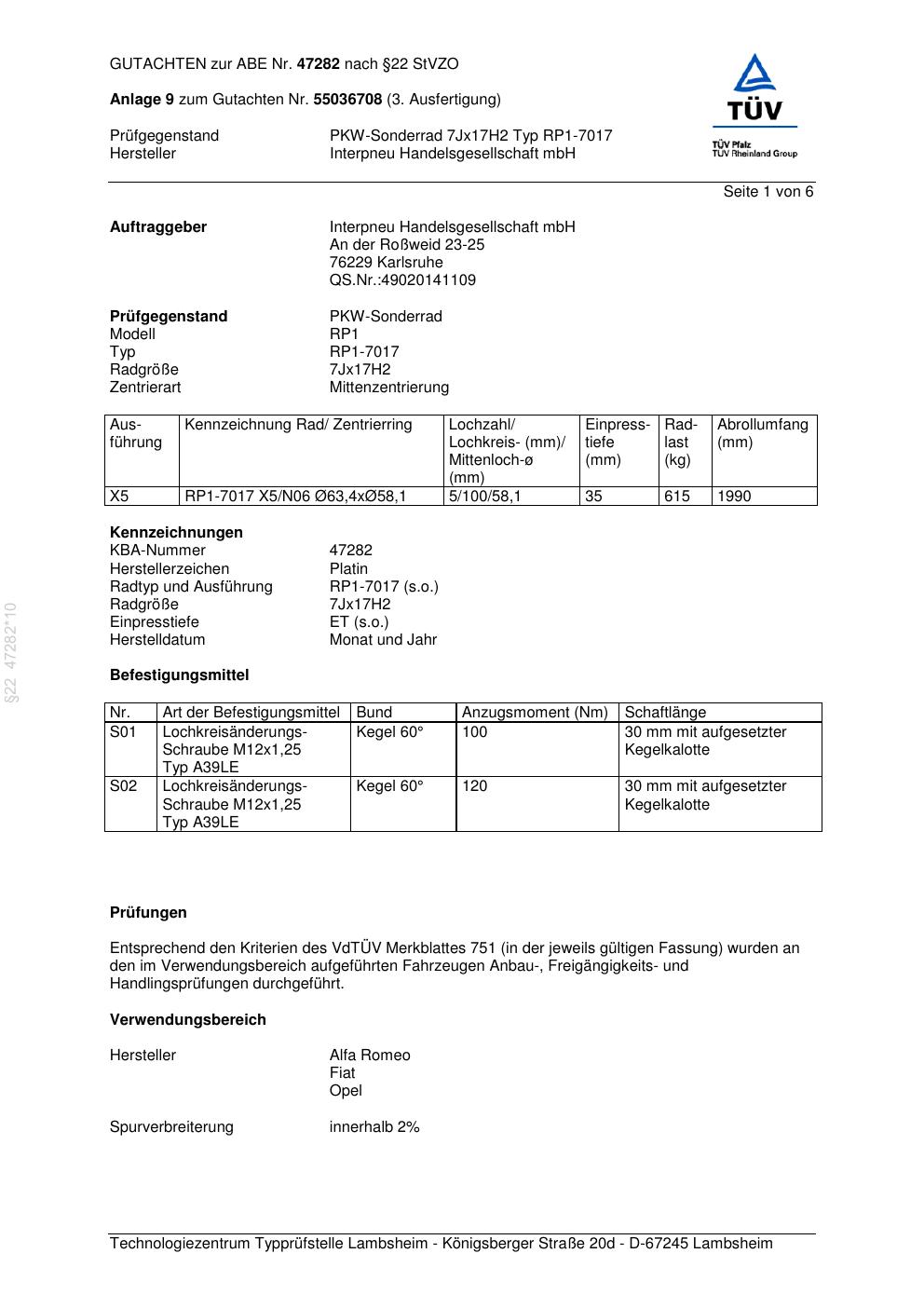 Dieses Gutachten (abe) bezieht sich auf die Alufelge Platin RP1-7017 in der Ausführung 7Jx17 ET 0, Mittenloch 0 mm (KBA 47282). Im PDF findest du typischerweise zulässige Reifengrößen, Auflagen/Anbauhinweise und – je nach Dokument – Hinweise zur Eintragung.