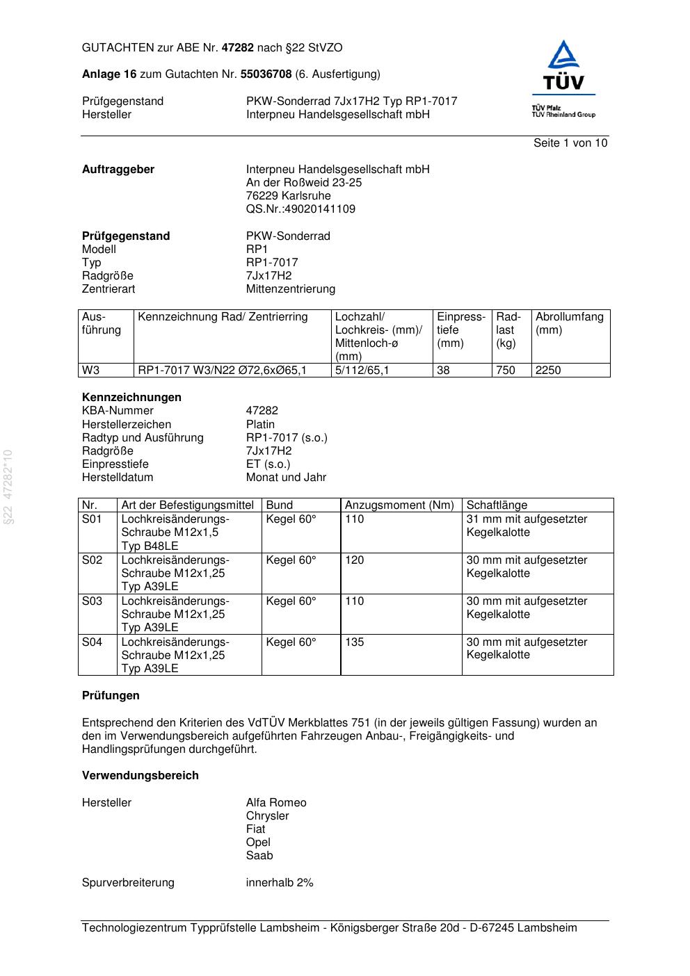 Dieses Gutachten (abe) bezieht sich auf die Alufelge Platin RP1-7017 in der Ausführung 7Jx17 ET 0, Mittenloch 0 mm (KBA 47282). Im PDF findest du typischerweise zulässige Reifengrößen, Auflagen/Anbauhinweise und – je nach Dokument – Hinweise zur Eintragung.