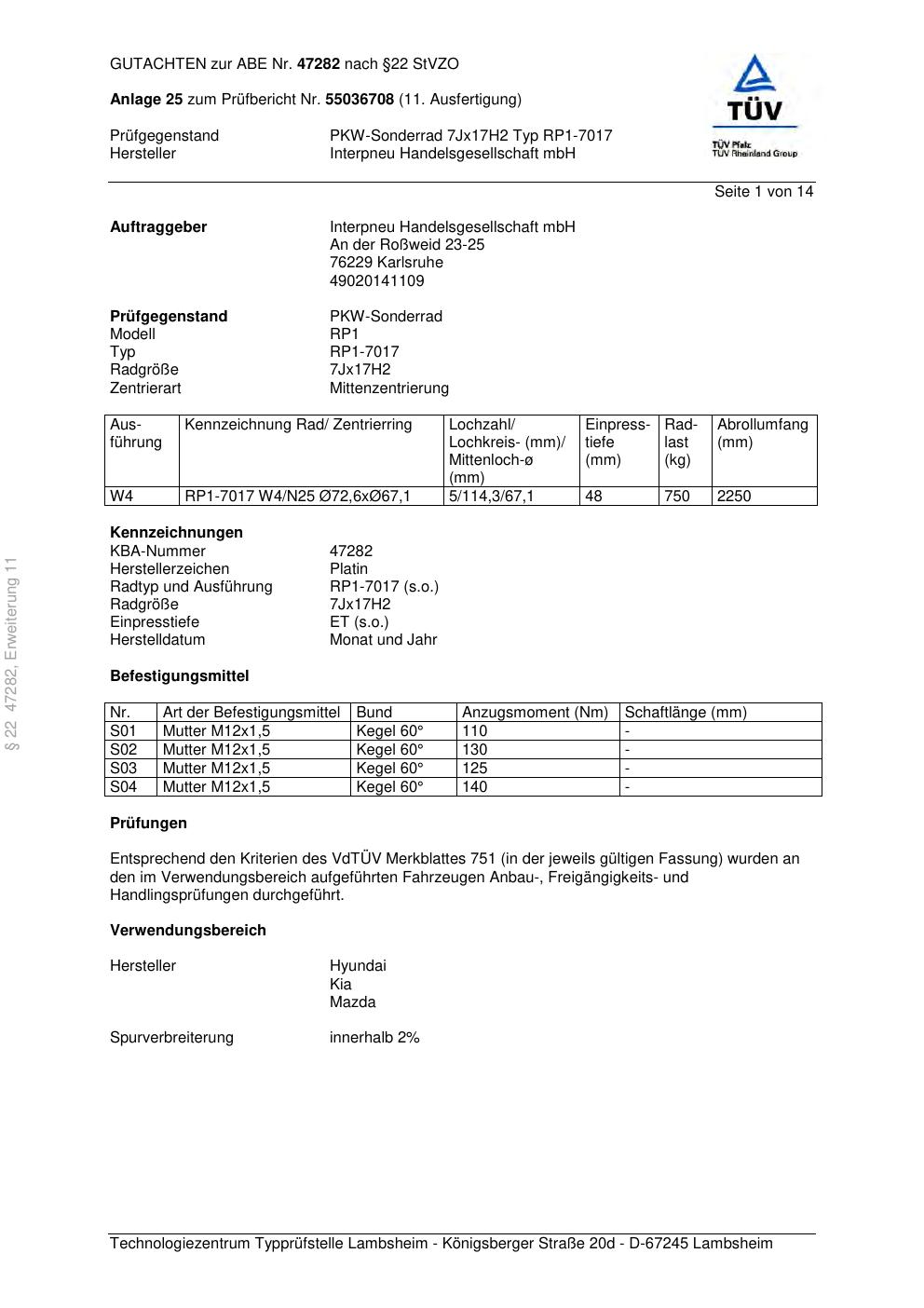 Dieses Gutachten (abe) bezieht sich auf die Alufelge Platin RP1-7017 in der Ausführung 7Jx17 ET 0, Mittenloch 0 mm (KBA 47282). Im PDF findest du typischerweise zulässige Reifengrößen, Auflagen/Anbauhinweise und – je nach Dokument – Hinweise zur Eintragung.
