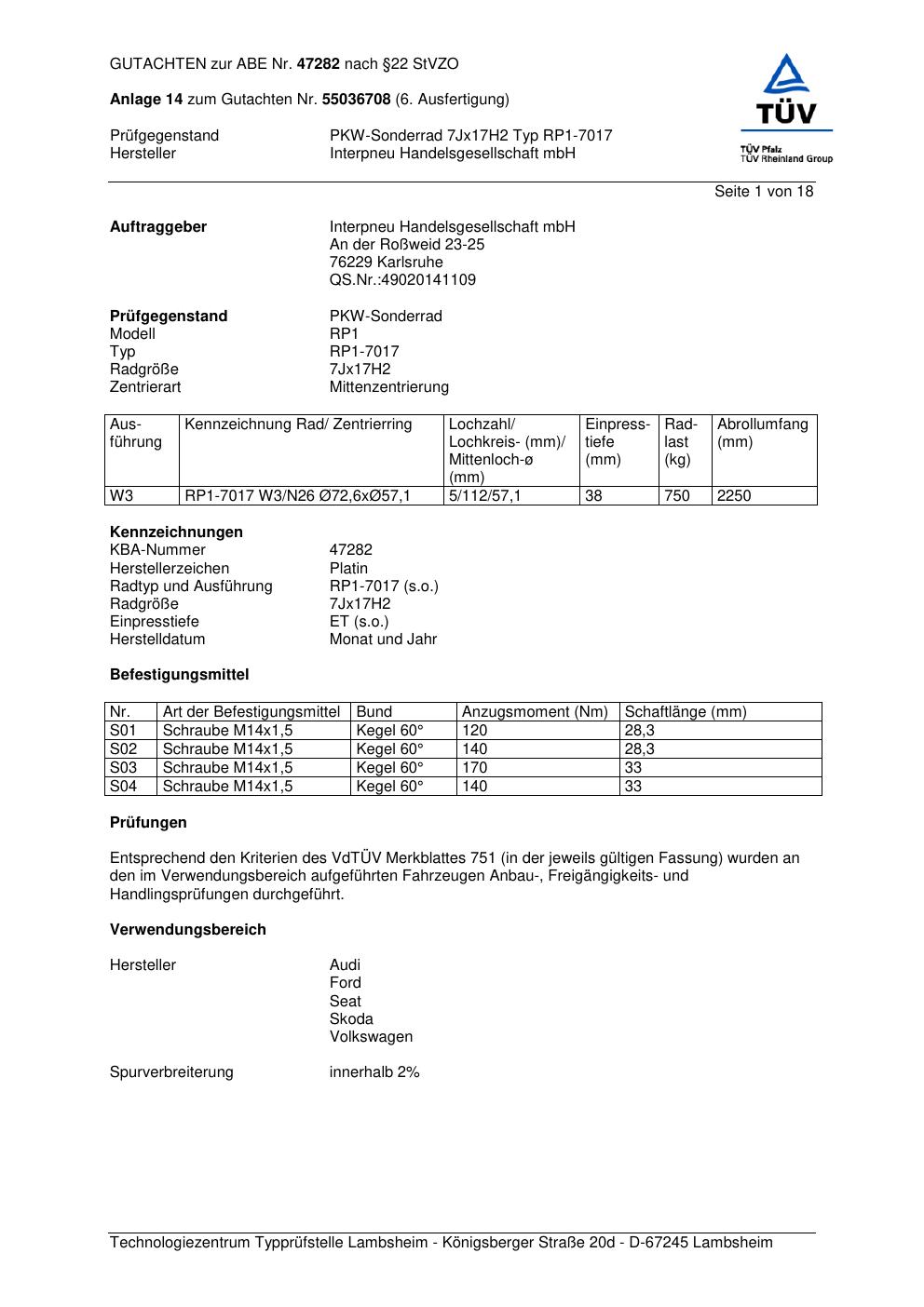 Dieses Gutachten (abe) bezieht sich auf die Alufelge Platin RP1-7017 in der Ausführung 7Jx17 ET 0, Mittenloch 0 mm (KBA 47282). Im PDF findest du typischerweise zulässige Reifengrößen, Auflagen/Anbauhinweise und – je nach Dokument – Hinweise zur Eintragung.