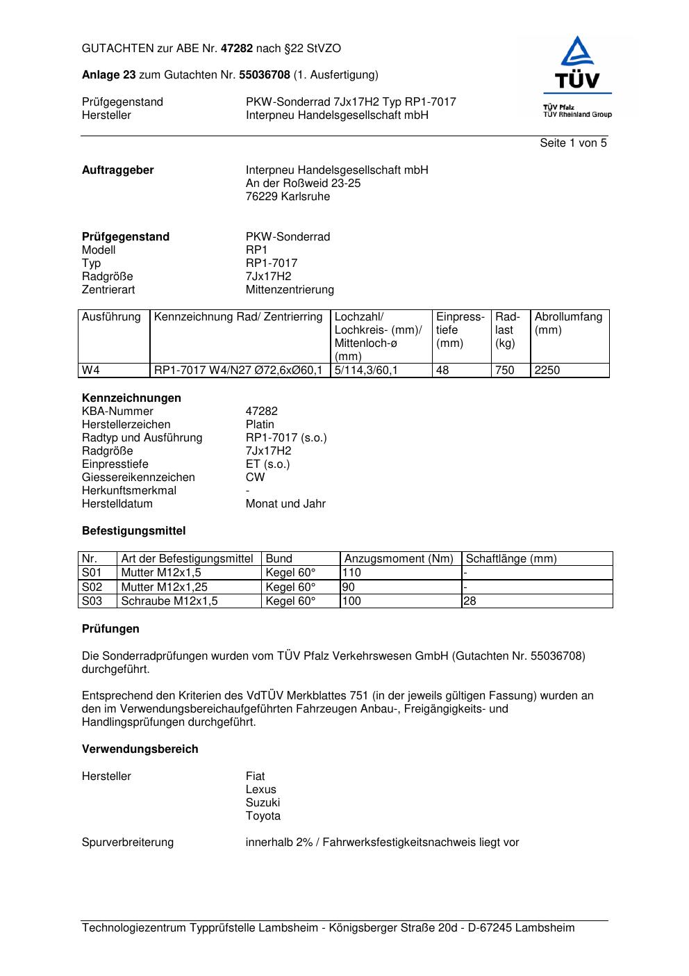Dieses Gutachten (abe) bezieht sich auf die Alufelge Platin RP1-7017 in der Ausführung 7Jx17 ET 0, Mittenloch 0 mm (KBA 47282). Im PDF findest du typischerweise zulässige Reifengrößen, Auflagen/Anbauhinweise und – je nach Dokument – Hinweise zur Eintragung.