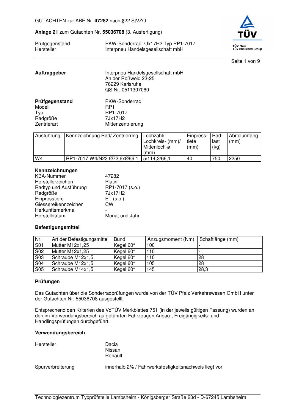 Dieses Gutachten (abe) bezieht sich auf die Alufelge Platin RP1-7017 in der Ausführung 7Jx17 ET 0, Mittenloch 0 mm (KBA 47282). Im PDF findest du typischerweise zulässige Reifengrößen, Auflagen/Anbauhinweise und – je nach Dokument – Hinweise zur Eintragung.