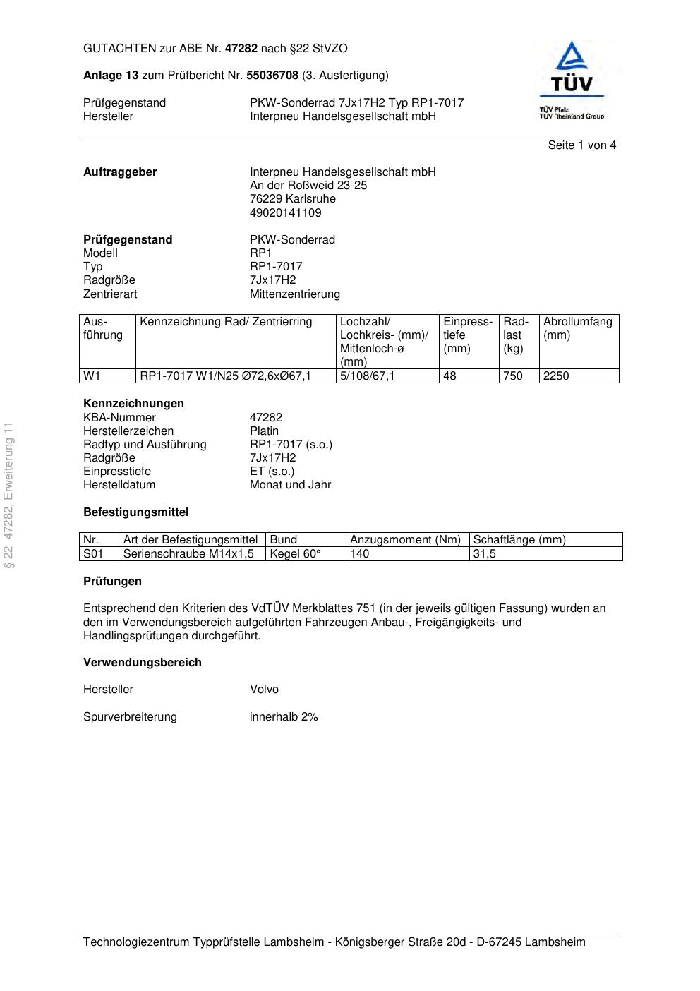 Dieses Gutachten (abe) bezieht sich auf die Alufelge Platin RP1-7017 in der Ausführung 7Jx17 ET 0, Mittenloch 0 mm (KBA 47282). Im PDF findest du typischerweise zulässige Reifengrößen, Auflagen/Anbauhinweise und – je nach Dokument – Hinweise zur Eintragung.