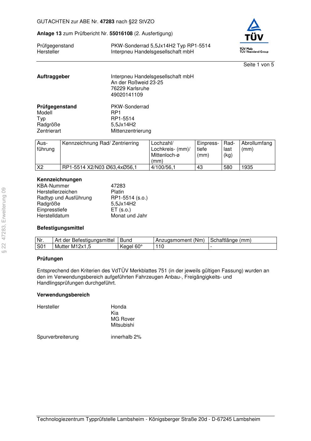 Dieses Gutachten (abe) bezieht sich auf die Alufelge Platin RP1-5514 in der Ausführung 5.5Jx14 ET 0, Mittenloch 0 mm (KBA 47283). Im PDF findest du typischerweise zulässige Reifengrößen, Auflagen/Anbauhinweise und – je nach Dokument – Hinweise zur Eintragung.