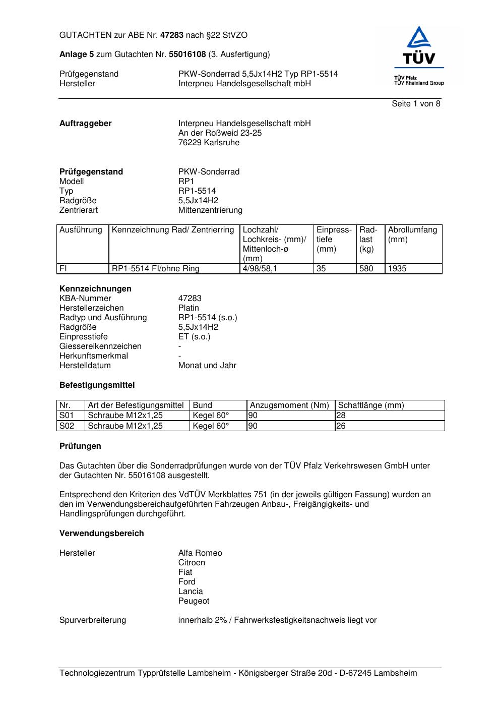 Dieses Gutachten (abe) bezieht sich auf die Alufelge Platin RP1-5514 in der Ausführung 5.5Jx14 ET 0, Mittenloch 0 mm (KBA 47283). Im PDF findest du typischerweise zulässige Reifengrößen, Auflagen/Anbauhinweise und – je nach Dokument – Hinweise zur Eintragung.
