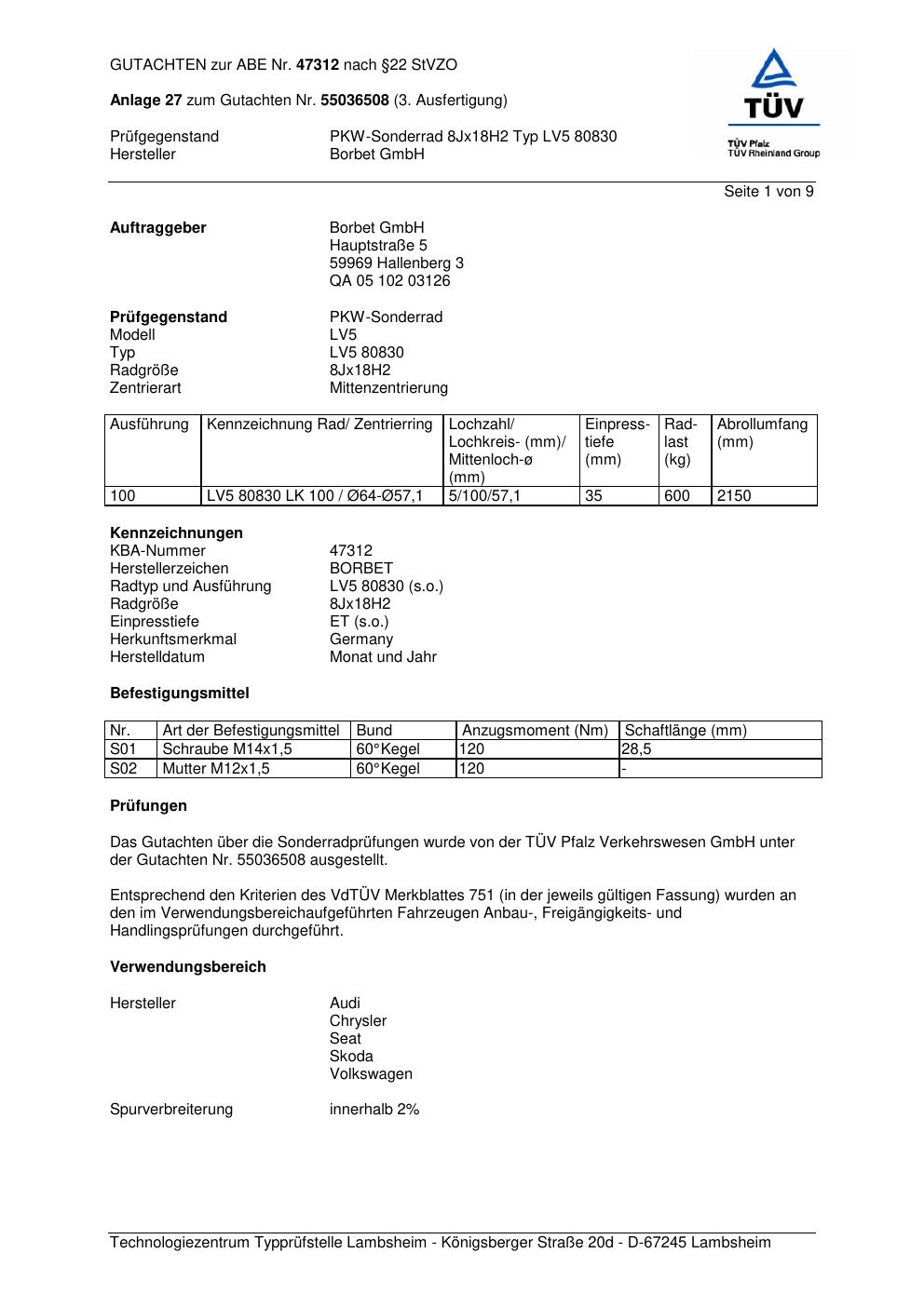 Dieses Gutachten (abe) bezieht sich auf die Alufelge Borbet LV5 80830 in der Ausführung 8Jx18 ET 0, Mittenloch 0 mm (KBA 47312). Im PDF findest du typischerweise zulässige Reifengrößen, Auflagen/Anbauhinweise und – je nach Dokument – Hinweise zur Eintragung.