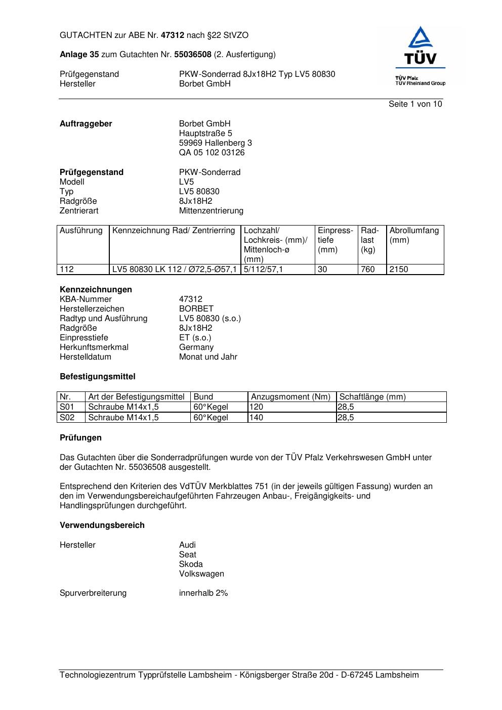 Dieses Gutachten (abe) bezieht sich auf die Alufelge Borbet LV5 80830 in der Ausführung 8Jx18 ET 0, Mittenloch 0 mm (KBA 47312). Im PDF findest du typischerweise zulässige Reifengrößen, Auflagen/Anbauhinweise und – je nach Dokument – Hinweise zur Eintragung.