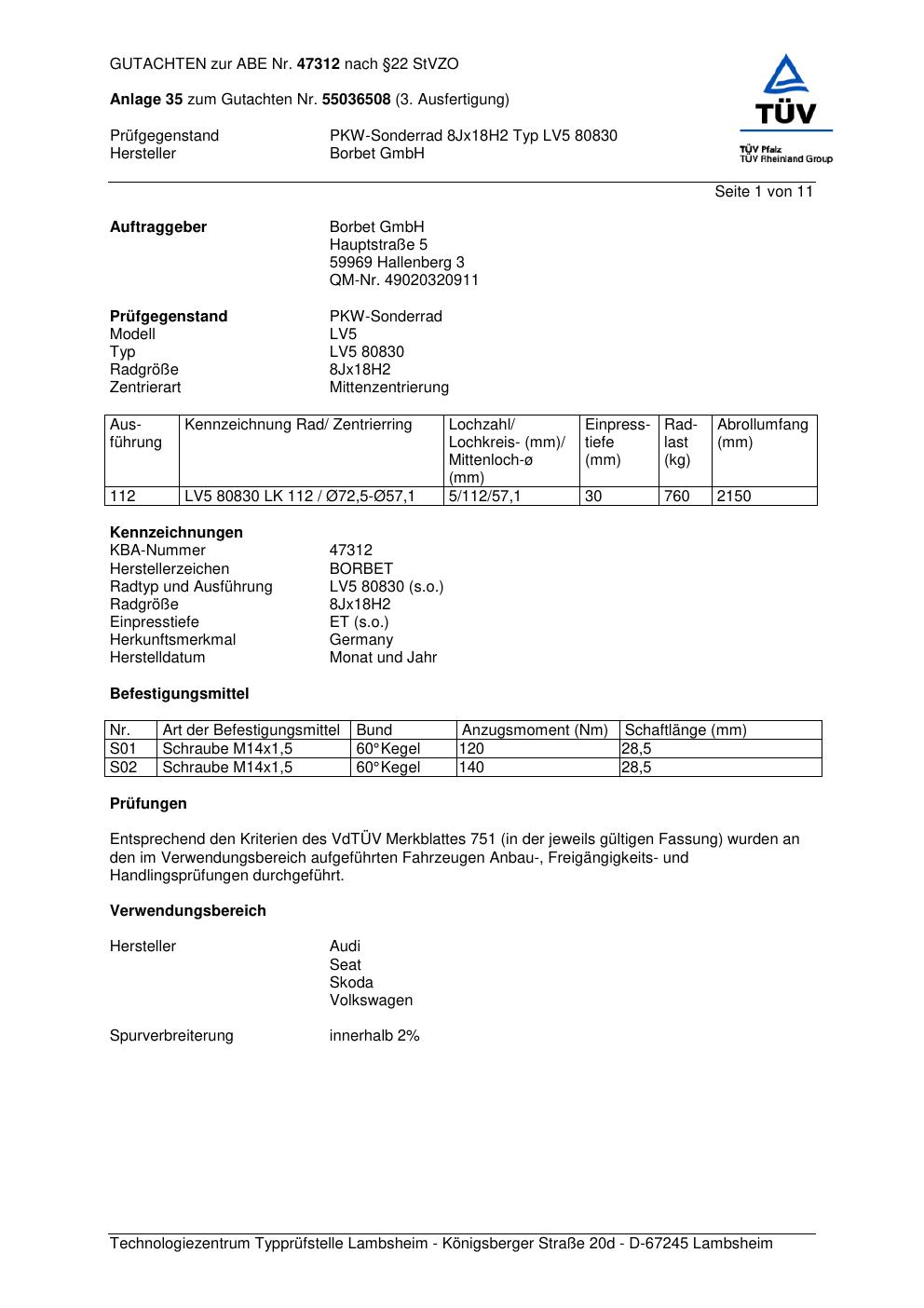 Dieses Gutachten (abe) bezieht sich auf die Alufelge Borbet LV5 80830 in der Ausführung 8Jx18 ET 0, Mittenloch 0 mm (KBA 47312). Im PDF findest du typischerweise zulässige Reifengrößen, Auflagen/Anbauhinweise und – je nach Dokument – Hinweise zur Eintragung.