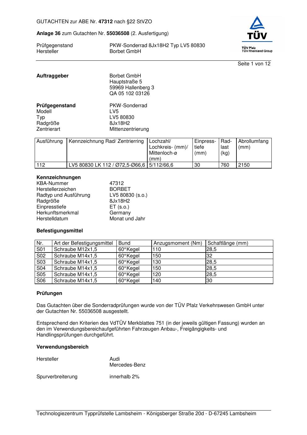 Dieses Gutachten (abe) bezieht sich auf die Alufelge Borbet LV5 80830 in der Ausführung 8Jx18 ET 0, Mittenloch 0 mm (KBA 47312). Im PDF findest du typischerweise zulässige Reifengrößen, Auflagen/Anbauhinweise und – je nach Dokument – Hinweise zur Eintragung.