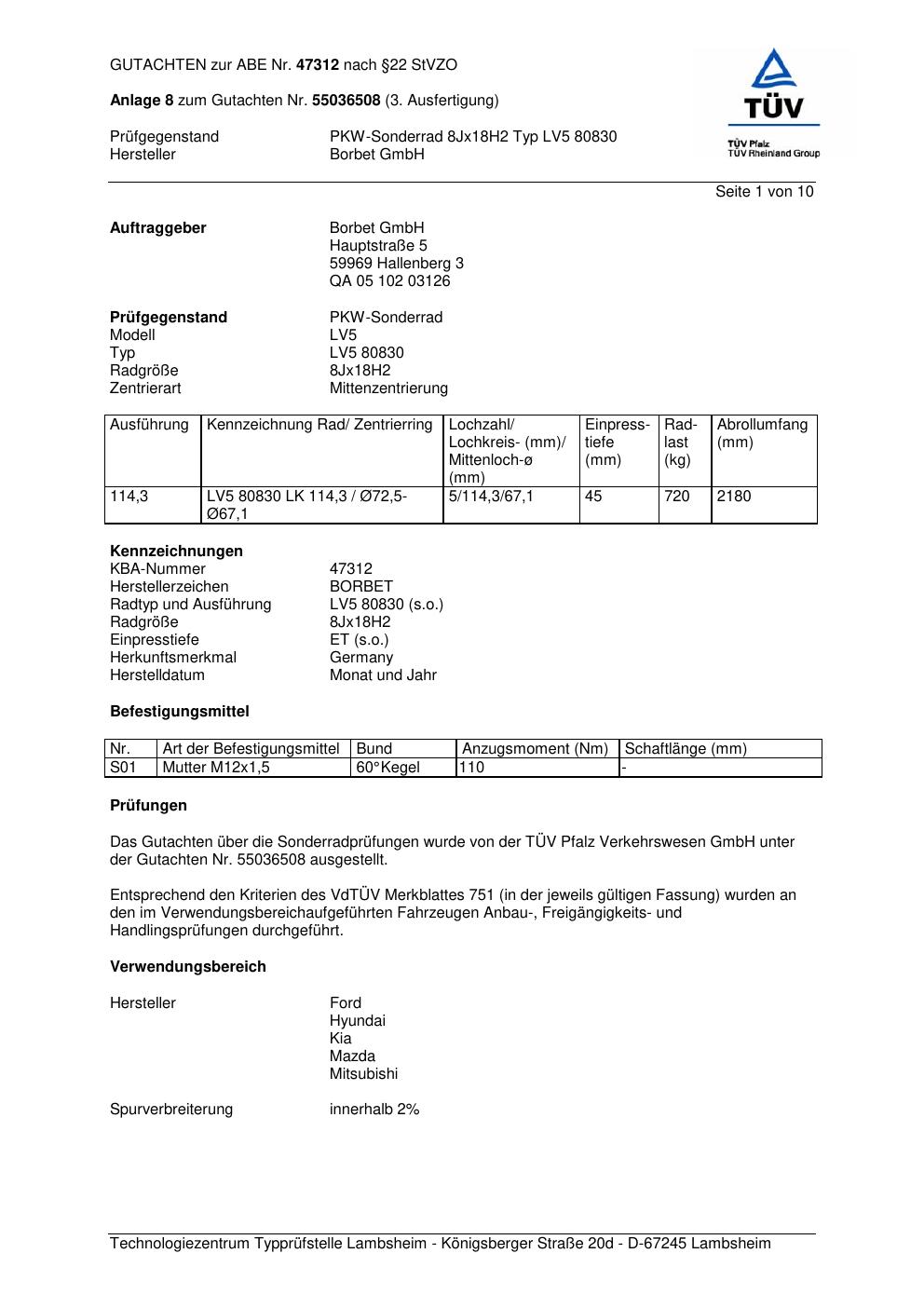 Dieses Gutachten (abe) bezieht sich auf die Alufelge Borbet LV5 80830 in der Ausführung 8Jx18 ET 0, Mittenloch 0 mm (KBA 47312). Im PDF findest du typischerweise zulässige Reifengrößen, Auflagen/Anbauhinweise und – je nach Dokument – Hinweise zur Eintragung.