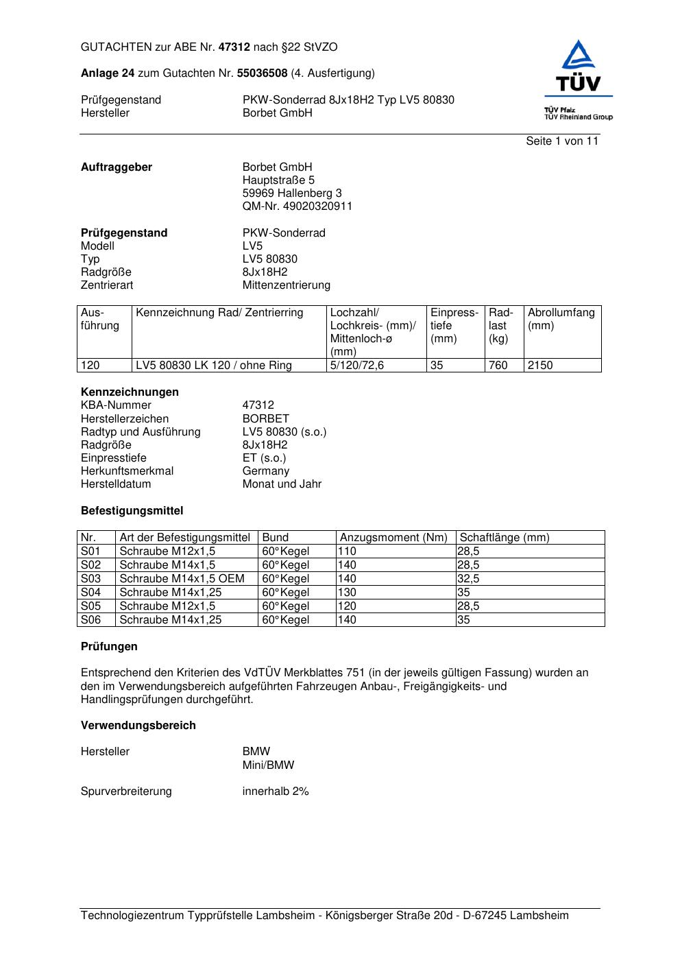 Dieses Gutachten (abe) bezieht sich auf die Alufelge Borbet LV5 80830 in der Ausführung 8Jx18 ET 0, Mittenloch 0 mm (KBA 47312). Im PDF findest du typischerweise zulässige Reifengrößen, Auflagen/Anbauhinweise und – je nach Dokument – Hinweise zur Eintragung.