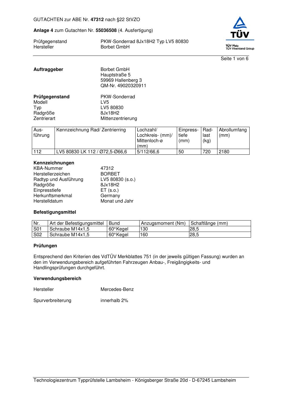 Dieses Gutachten (abe) bezieht sich auf die Alufelge Borbet LV5 80830 in der Ausführung 8Jx18 ET 0, Mittenloch 0 mm (KBA 47312). Im PDF findest du typischerweise zulässige Reifengrößen, Auflagen/Anbauhinweise und – je nach Dokument – Hinweise zur Eintragung.
